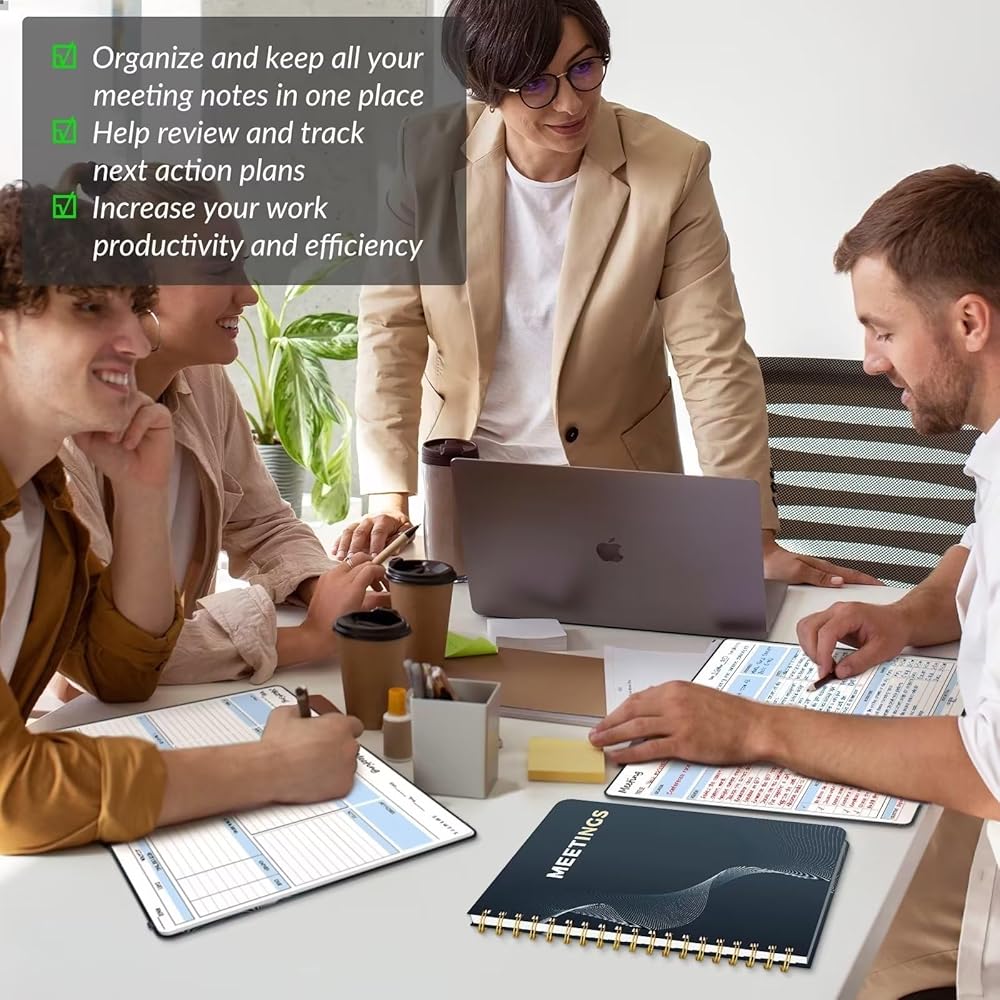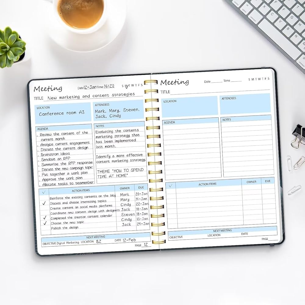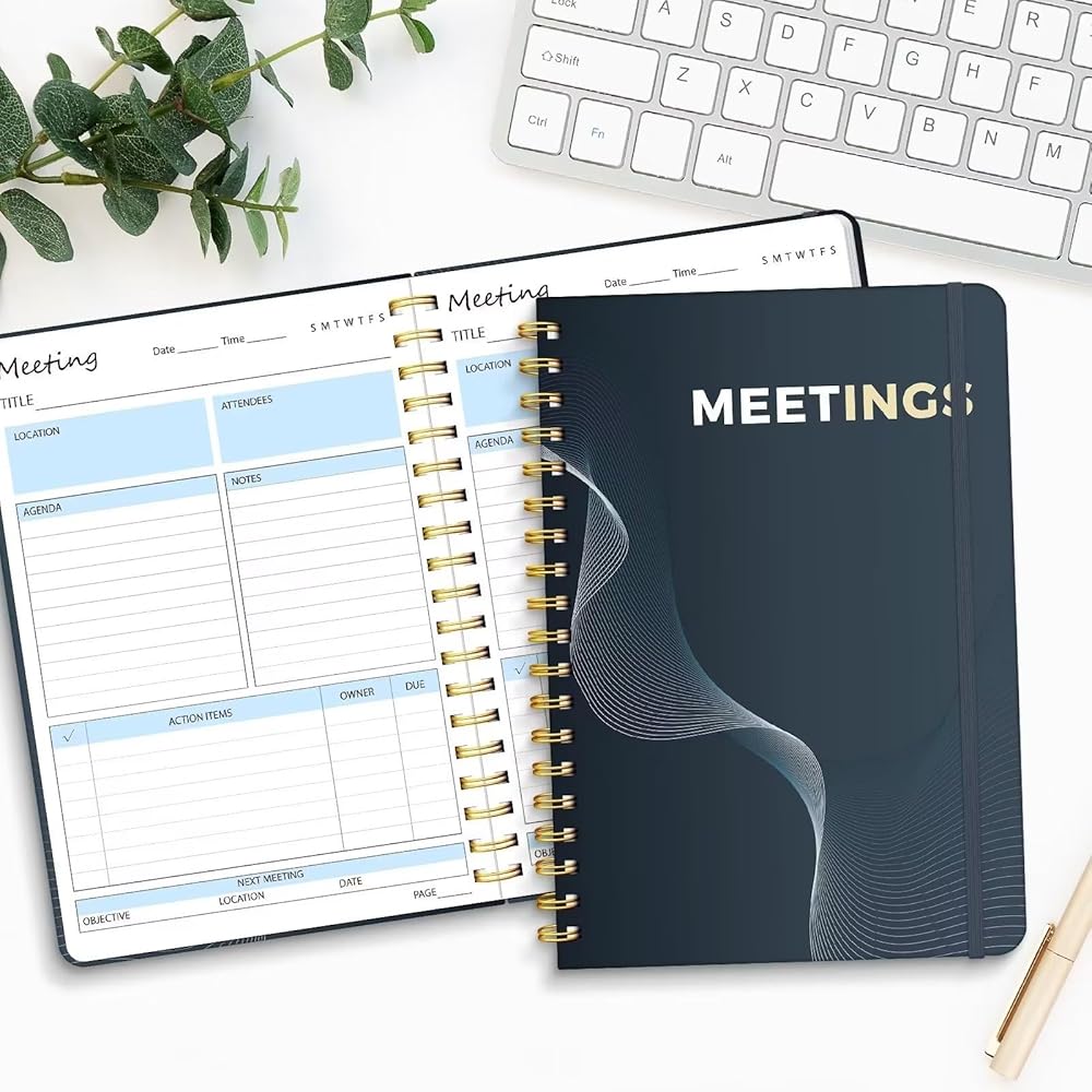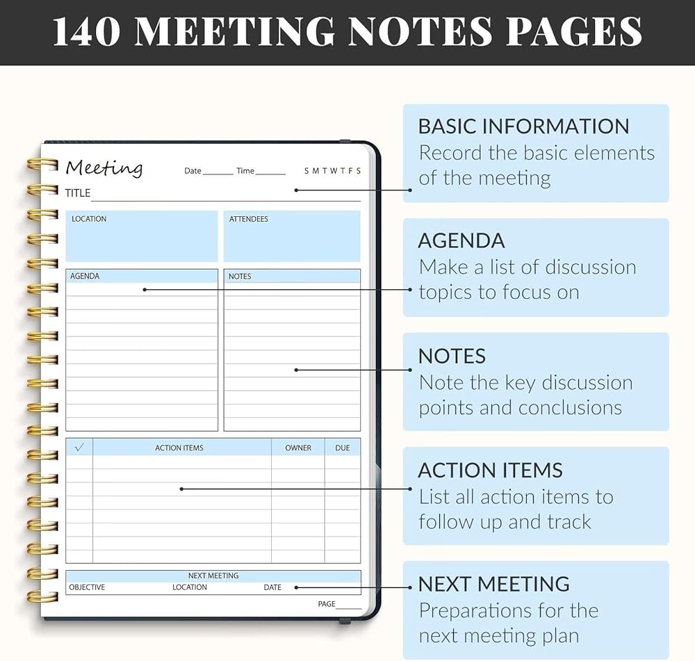 الحجم المثالي - حجم دفتر الأعمال هذا مثالي - حجم B5 القياسي (7 × 10 بوصات) وهو ليس كبيرًا جدًا ولا صغيرًا جدًا. من السهل حملها وتوفر مساحة واسعة لتسجيل جميع ملاحظات الاجتماعات الخاصة بك. الأداة التنظيمية المثالية لاجتماعاتك ومشاريعك التجارية.