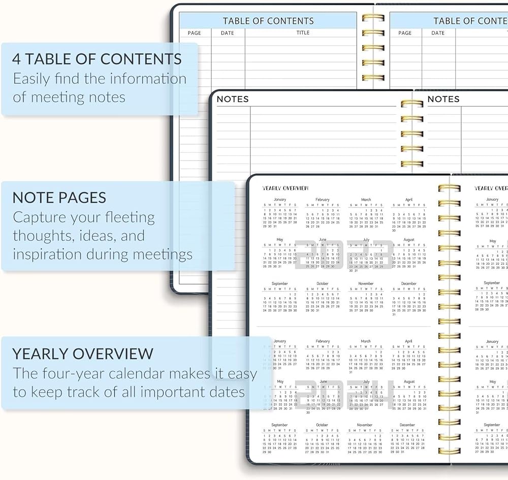 جودة فائقة - تم تصنيع دفتر الاجتماعات B5 هذا من ورق أبيض فاخر يمكنه تقليل نزيف الحبر بشكل فعال. بفضل غلافه الحلزوني ذو السلك المزدوج الذهبي والغلاف الصلب الجذاب، يسمح دفتر مخطط الاجتماعات بقلب الصفحات بسلاسة وهو مثالي للاستخدام الدائم والمتكرر.