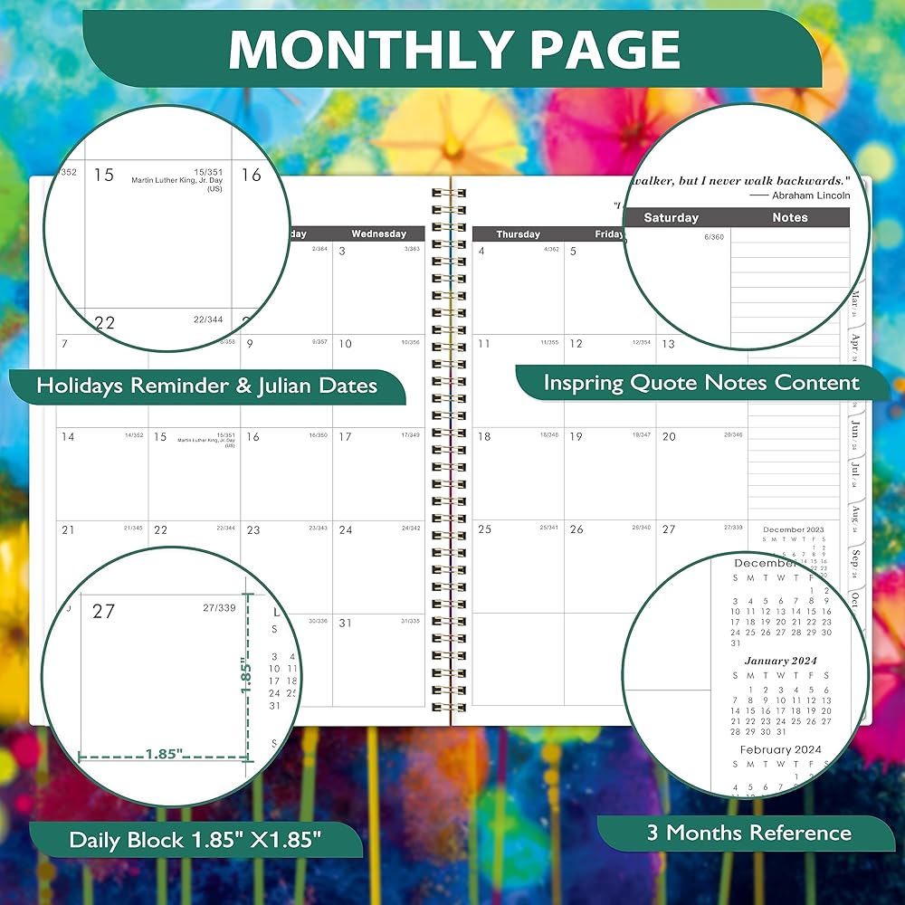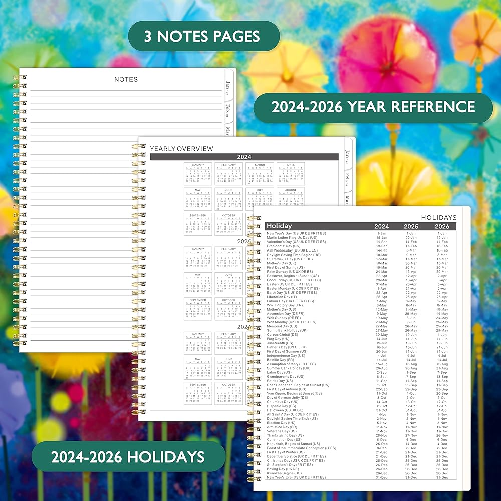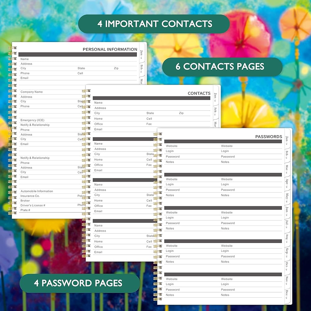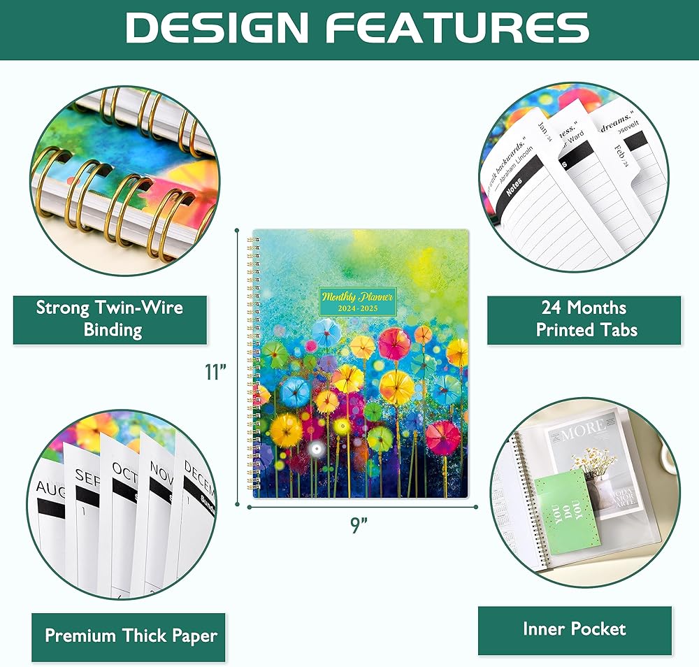 🌻PROFESSIONAL DESIGN -The special design of the 2024-2025 planner is 9" x 11". Planning Pages & Hardcover & Monthly Tabs & Strong Twin-Wire Binding & Inner Pocket & Yearly Overview of 2024-2026 & 4 passwords pages & 4 important contact pages & 6 contact pages. There are inspiring quotes on the page every month to keep you motivated throughout the month.