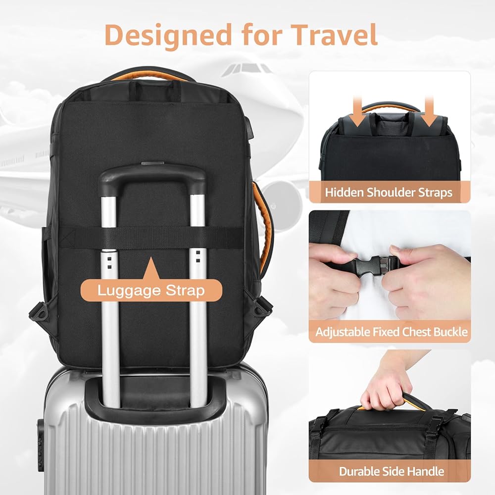 ✈حزام الأمتعة وتصميم عملي: تتميز حقيبة ظهر الكمبيوتر المحمول للسفر بتصميم حزام كتف مخفي يمكن إخفاؤه بسهولة داخل اللوحة الخلفية. يمكن لتصميم حزام الأمتعة تثبيت حقيبة الأغراض الشخصية على أنبوب الأمتعة، مما يساعدك على تحرير يديك وظهرك، مما يجعل سفر عملك أسهل. تم تصميم حقيبة الظهر بمقابض ناعمة في الأعلى والجوانب لسهولة الاستخدام اليومي.