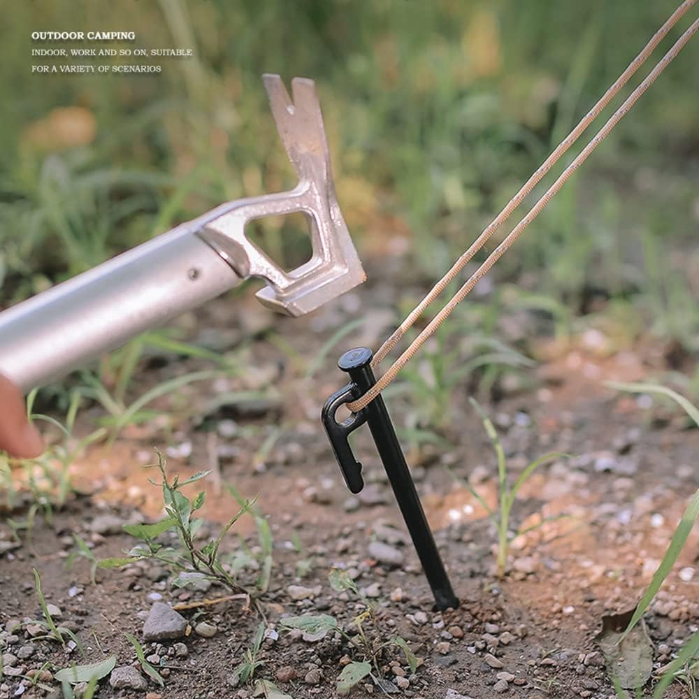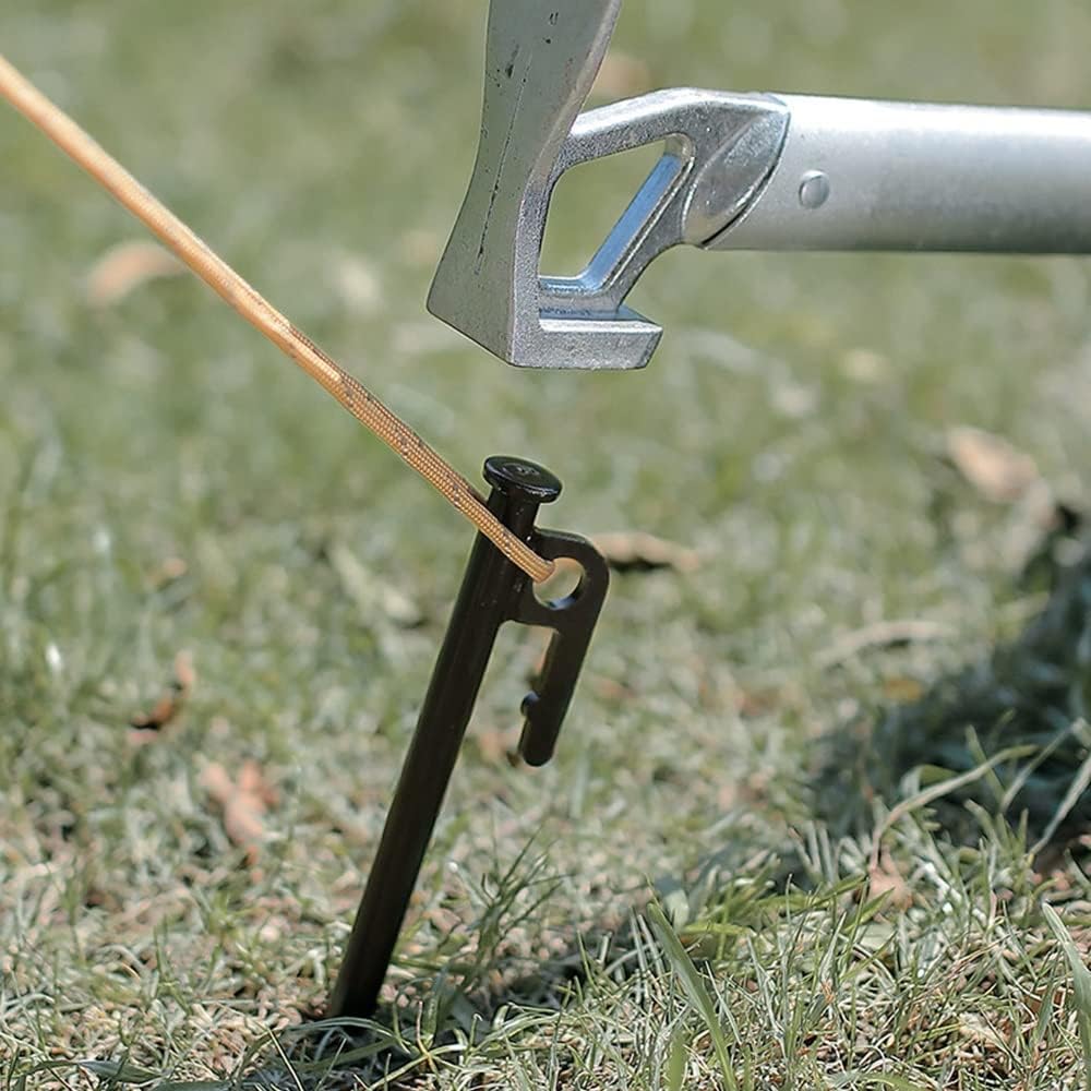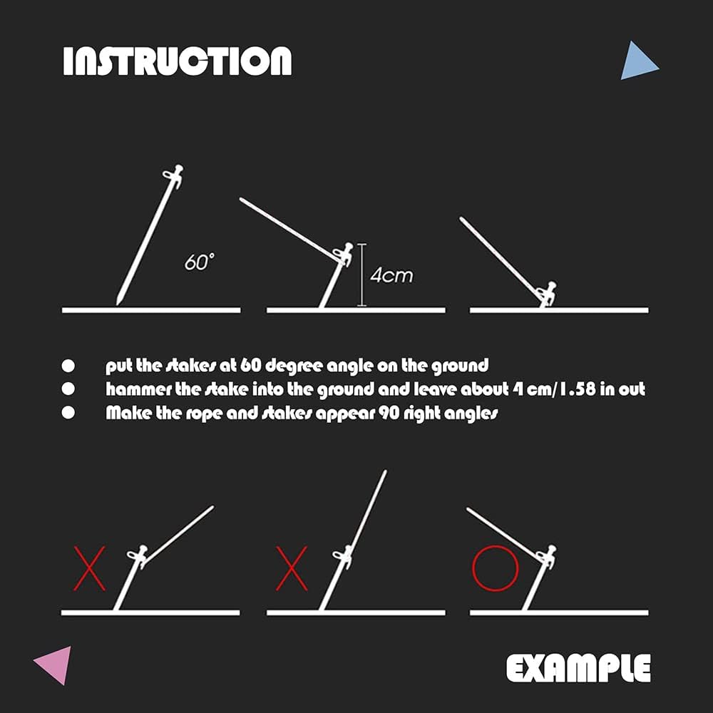 Tips for better use: - Please do not nail the tent stake vertically to the ground. - Make the tent stake and the ground into a 60-degree angle. - Please leave about 1.6 inches (4cm) of the tent stake on the ground to have enough room to tight the rope. - Use the hook to tight the rope. - Use the hole to pull out the tent stake.