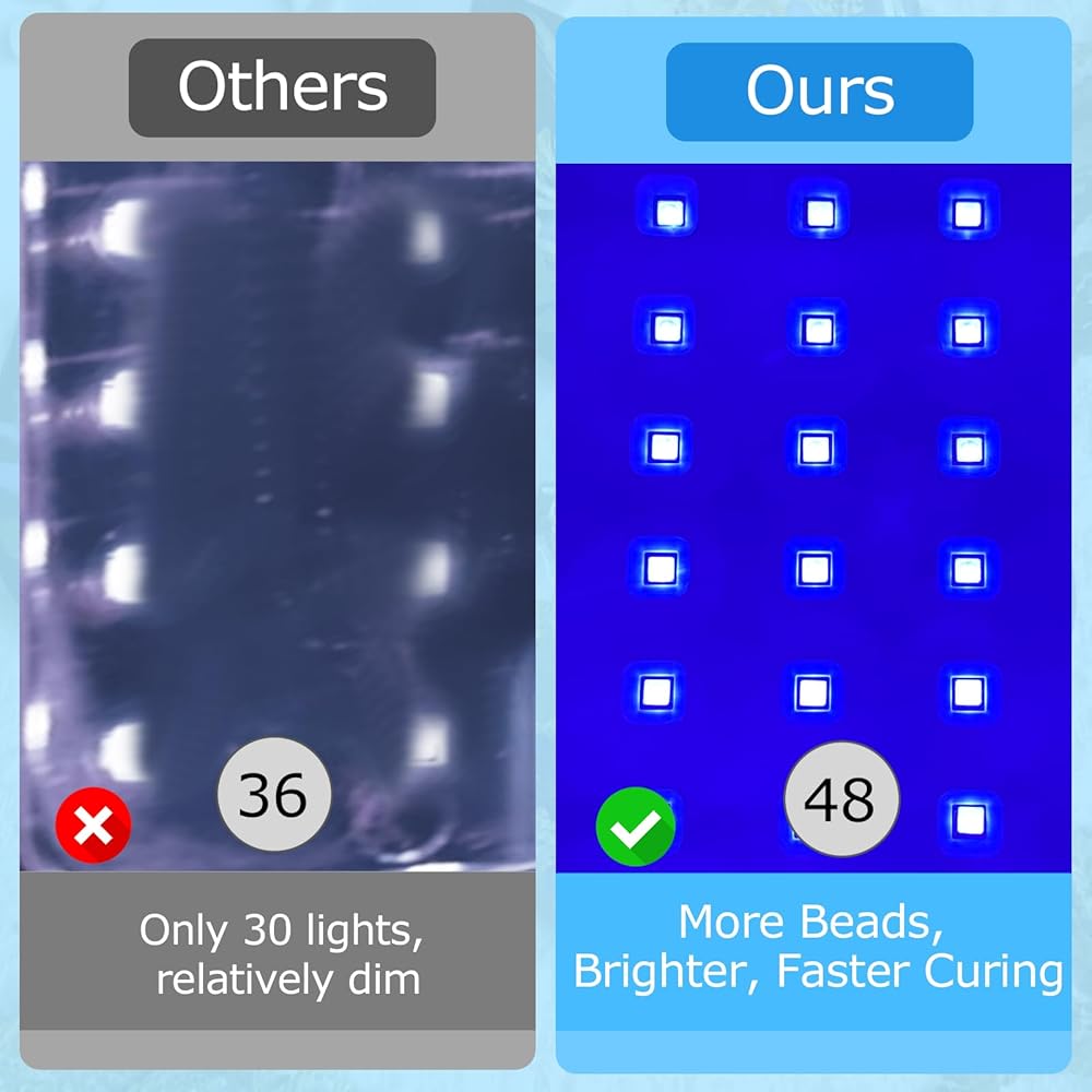 • ✅48 LAMP BEADS: In order to achieve better curing effect, we matched this uv light for resin curing with 48 lamp beads, 360 degree surround irradiation, faster curing speed and better curing effect.