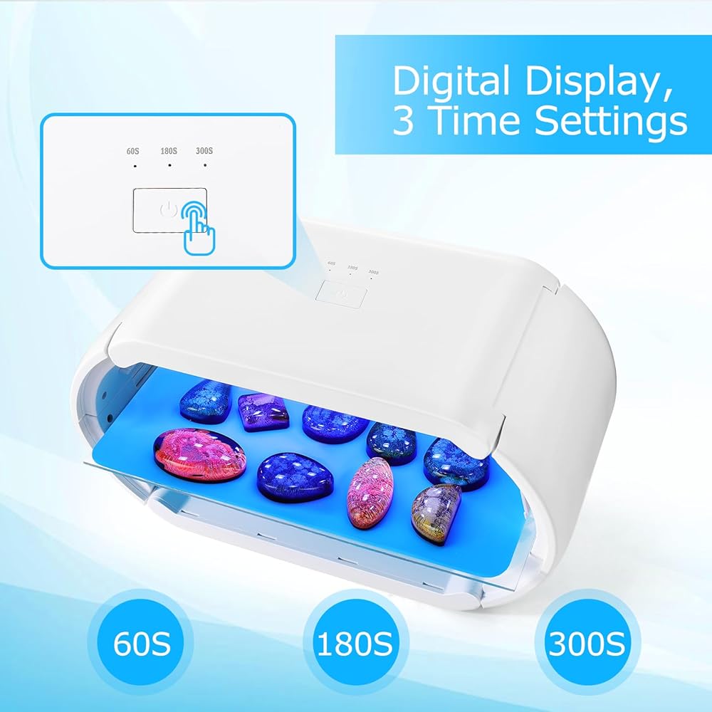 • ✅DIGITAL DISPLAY SCREEN & 3 TIME MODES: This uv lamp for resin curing is easy to use with a clear digital display screen and three curing time modes that can be set for 1, 2 and 5 minutes.