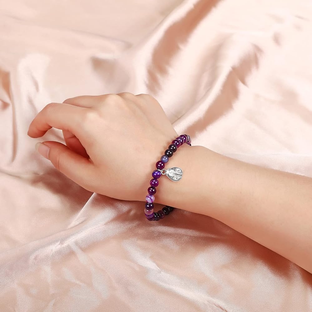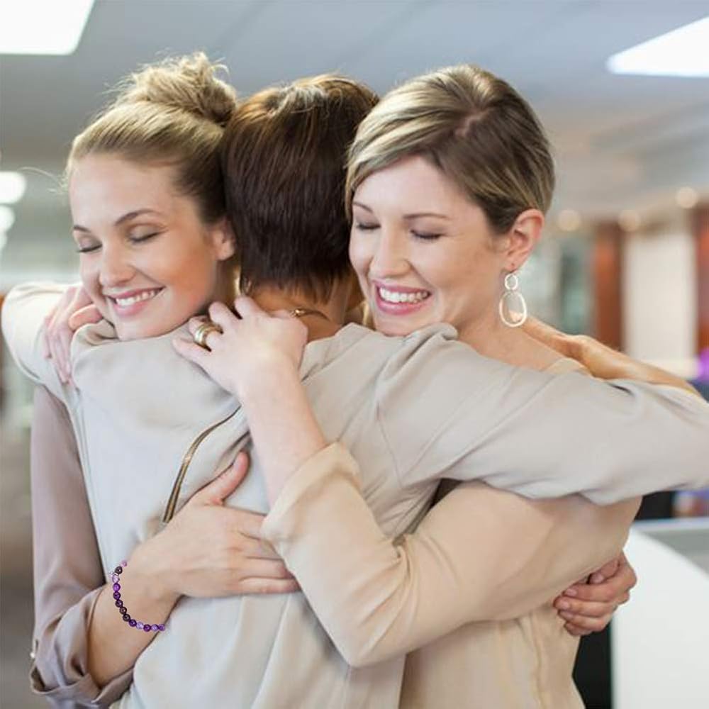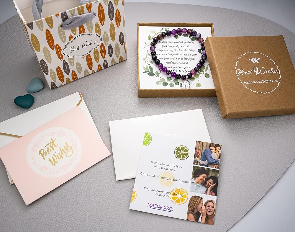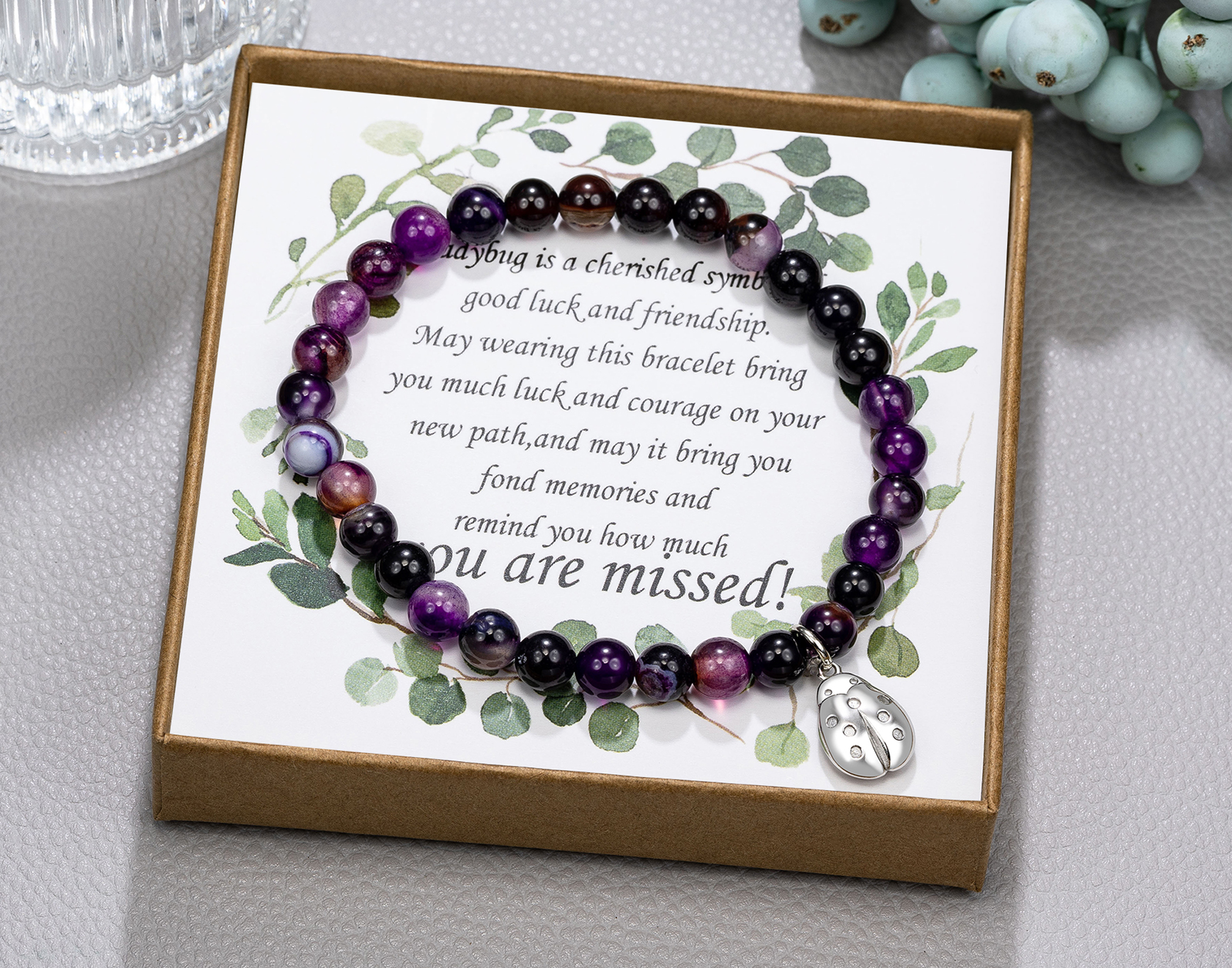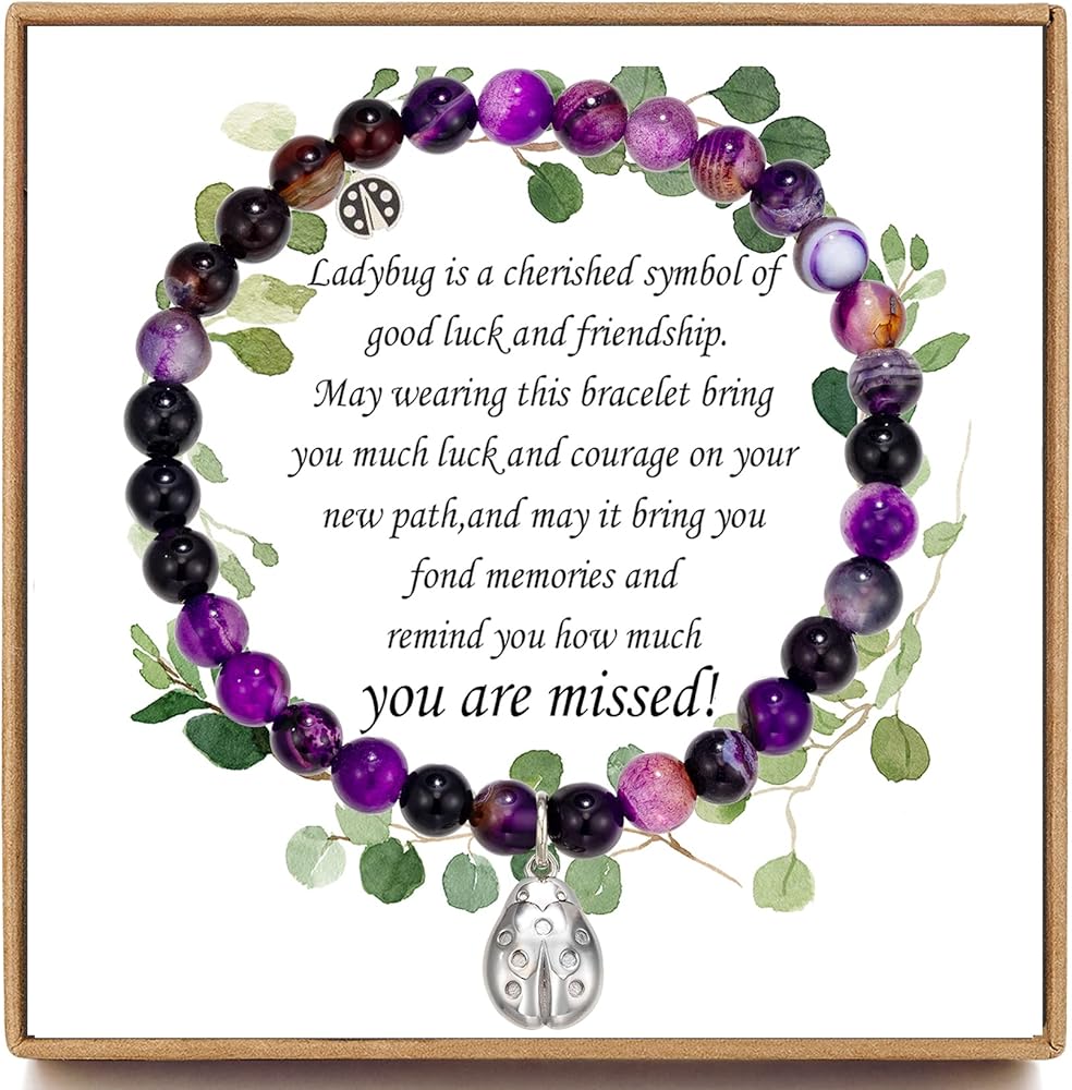 سوار الوداع: الجمشت هو حجر التحول والشفاء والتطهير. سحر الخنفساء هو رمز للحظ السعيد والصداقة. الكلمات على البطاقة: قد يجلب لك ارتداء هذا السوار الكثير من الحظ والشجاعة في طريقك الجديد وقد يجلب لك ذكريات جميلة ويذكرك بمدى افتقادك.