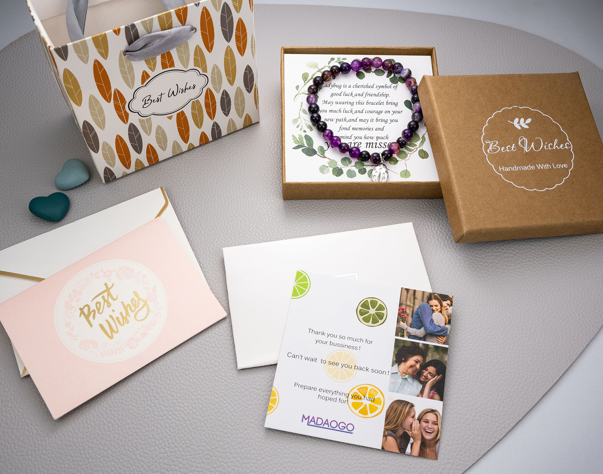 مجموعة هدايا Going Away: تتضمن سوار الخنفساء، وصندوق هدايا، وقطعة قماش تلميع فضية، وبطاقة تهنئة فارغة، وحقيبة هدايا، ومظروف، وحقيبة ناعمة. تم وضع السوار بعناية على بطاقة الحظ السعيد. لا يتطلب الأمر سوى بضع دقائق لإنهاء بطاقة الرسالة وتجميع الهدية، مما يجعلها ذات معنى أكبر.