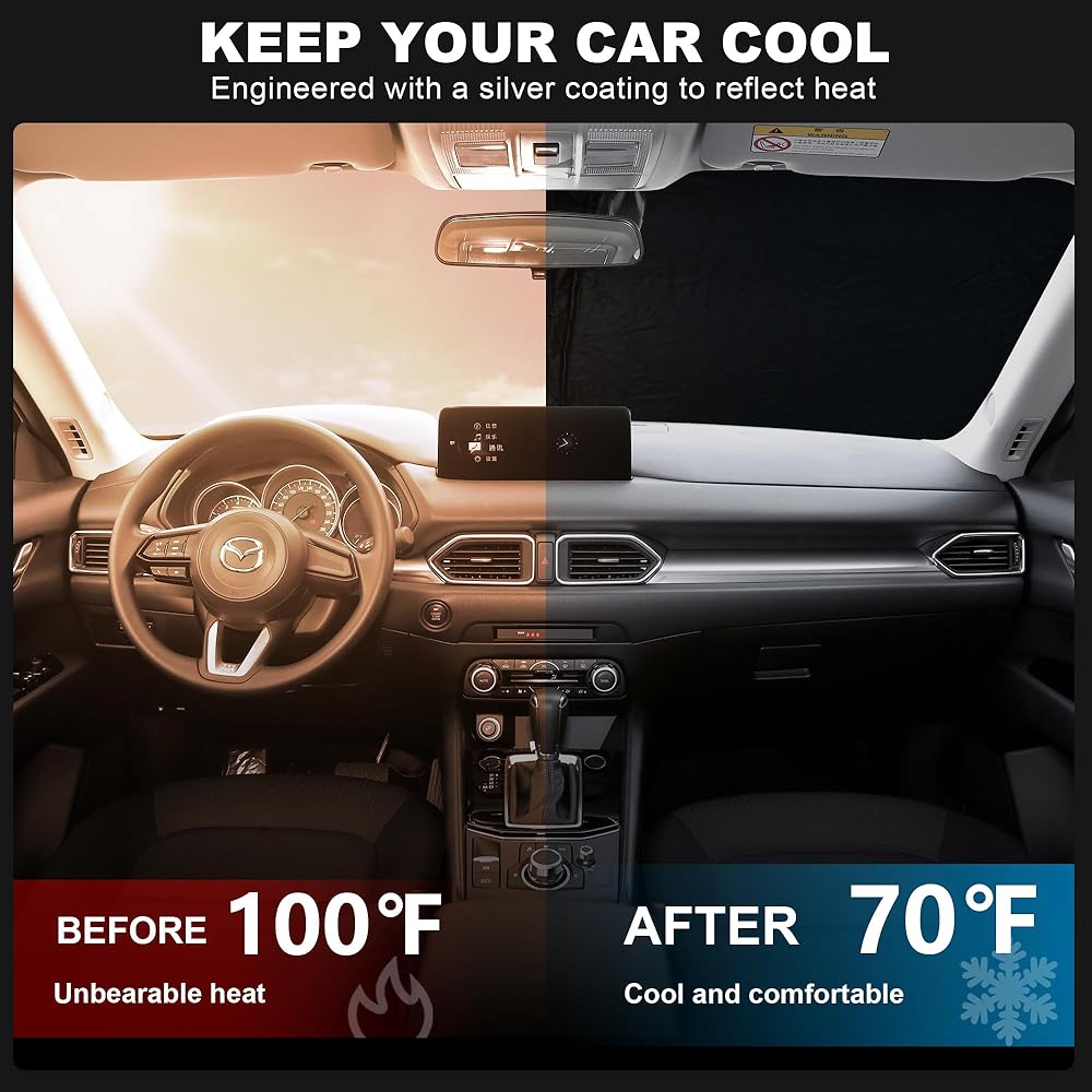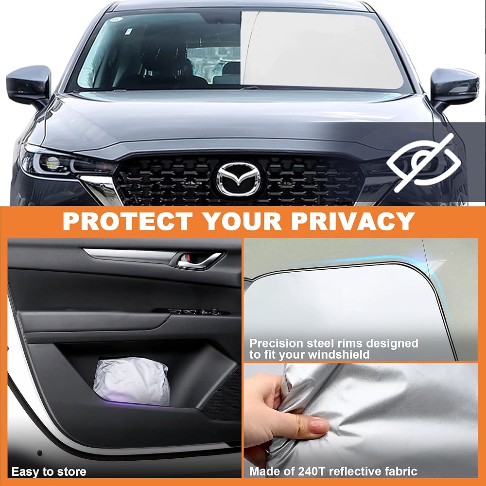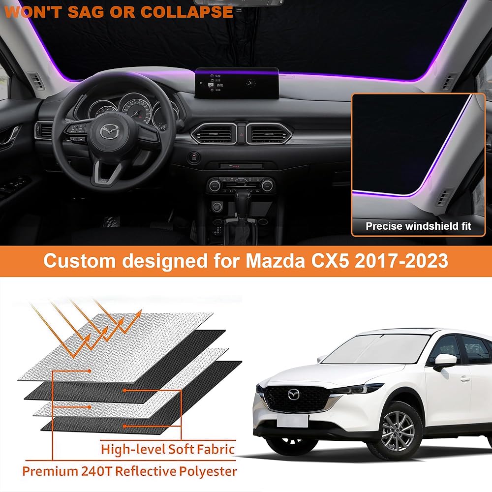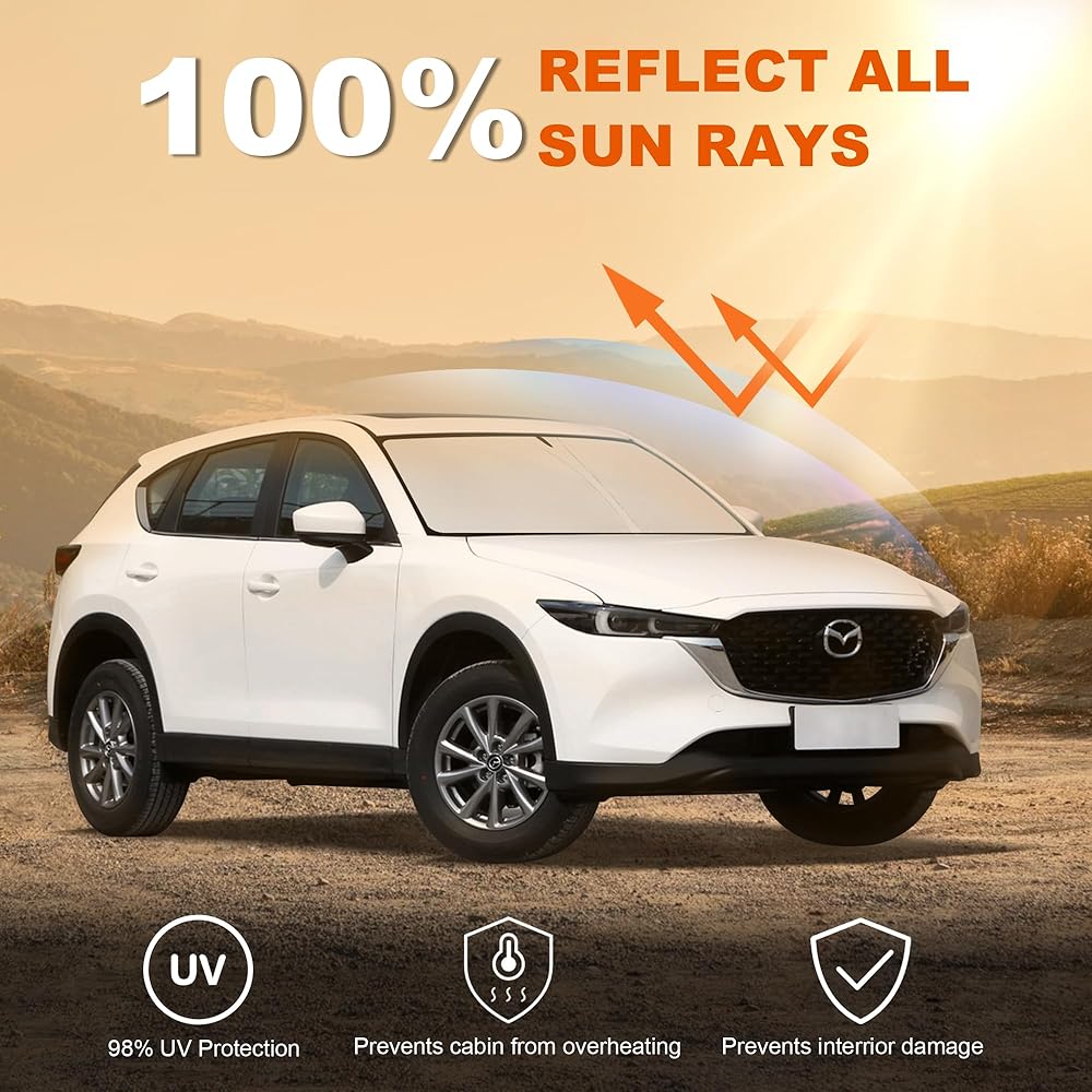 • 🚗【مواصفات السيارة】مظلة الشمس للزجاج الأمامي للسيارة Mazda CX5 Sport، Touring، Grand Touring 2017-2023، تغطي الزجاج الأمامي بالكامل، بدون فجوات، ملاءمة مثالية بنسبة 100%.