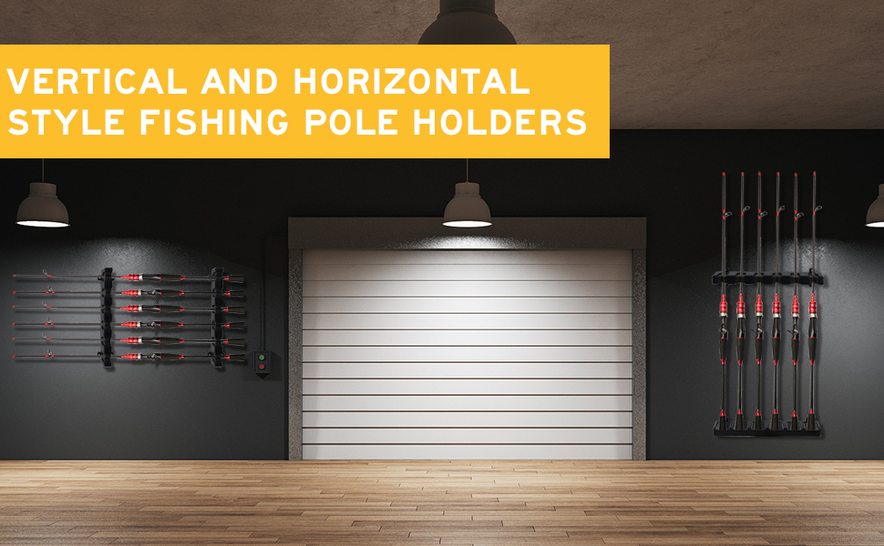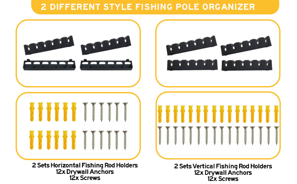 【خياران】لدينا نمطان من رف صنارة الصيد (12.5 بوصة × 2.5 بوصة × 1.1 بوصة): النمط الرأسي والأفقي. يمكن تركيب حامل صنارة الصيد على الحائط، مما يحافظ على قضيبك بعيدًا عن الأرض لمنع الضرر. الأفقي يمكن تركيب رف الحائط لقضيب الصيد أفقيًا على الحائط لتجنب إيذاء الأطفال.