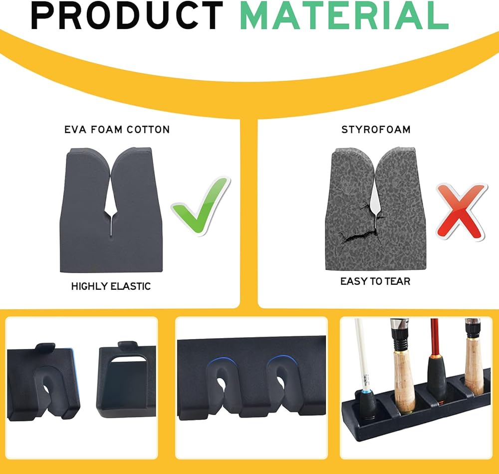 【مادة متينة وناعمة】رفوف صنارة الصيد مصنوعة من قاعدة أكريلونتريل بوتادين ستايرين المتينة ووسادة قبضة إسفنجية EVA عالية الجودة، رف الصيد يتمتع بمرونة جيدة ويمسك القضيب بقوة لمنع الخدوش. تحتوي حوامل صنارة الصيد على الحائط على ستة أخاديد لتغليف القضيب جيدًا وهي مناسبة لمعظم أدوات الصيد.