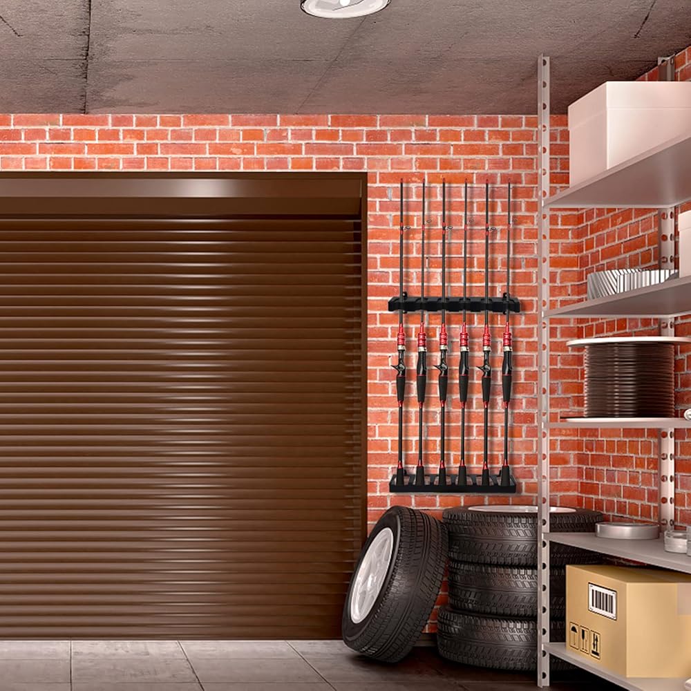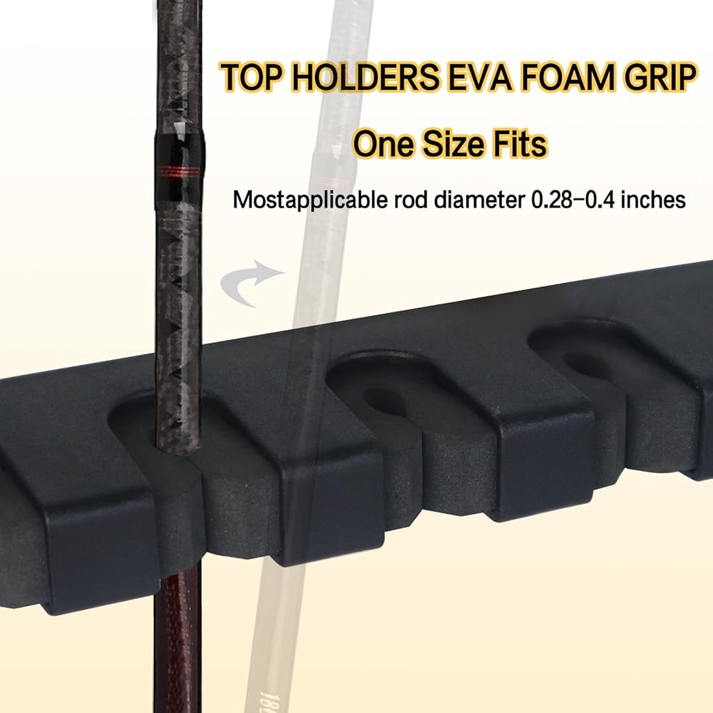 【موفر للمساحة، قضبان حماية】حامل عمود السمك مقاس 12.5 سم يحمل ما يصل إلى 6 قضبان أو مجموعات لتوفير المساحة، يمكنك بسهولة تخزين القضيب الخاص بك والتخلص من الفوضى، ويحافظ على مؤخرة القضيب بعيدًا عن الأرض، ويمكنك أيضًا ضبط المسافة بين اثنين من رفوف القضبان يعتمد على احتياجاتك.