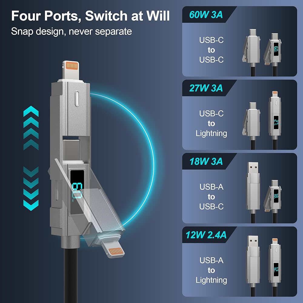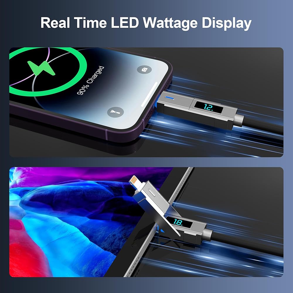 【شاشة LED 4 في 1】 تم تصميم كابل الشاحن المتعدد 4 في 1 بفكرة تبسيط حياتك. فهو يجمع بين أربعة منافذ وشاشة LED في كابل واحد. USB A إلى USB C، ومن USB A إلى Lightning، ومن USB C إلى Lightning، ومن USB C إلى USB C. البساطة والكفاءة، لا حاجة لحمل كابلات متعددة لأجهزة مختلفة.