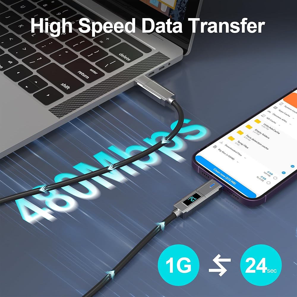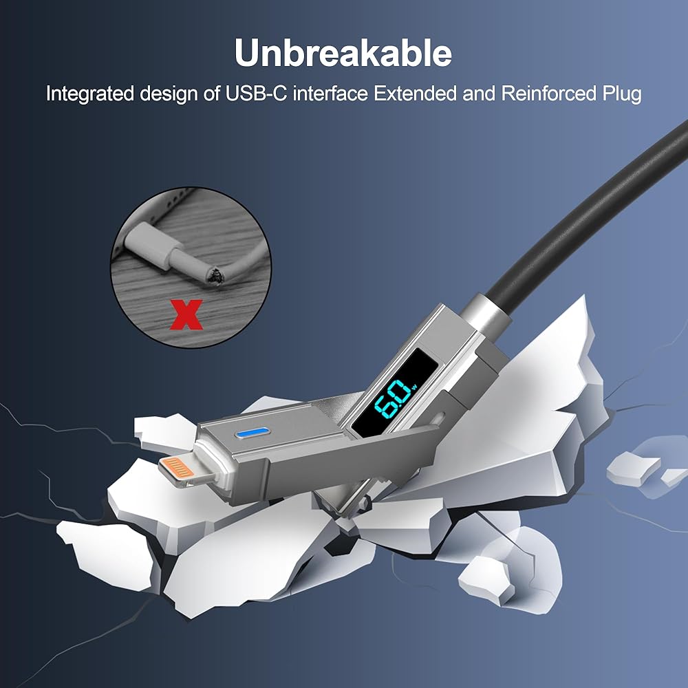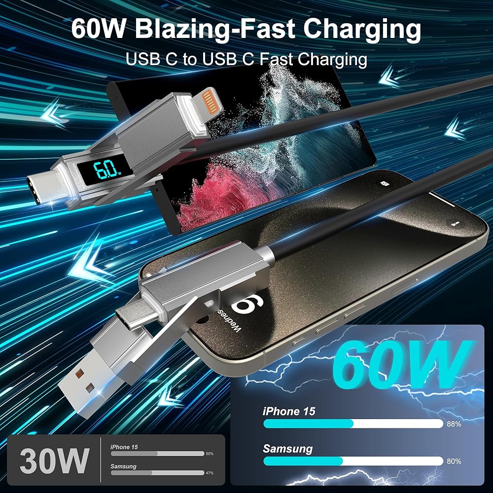 【شاشة رقمية LED ذكية للطاقة】يتميز كابل الشحن السريع USB C 4 في 1 بشاشة عرض طاقة LED في الوقت الحقيقي تظهر حالة الشحن الخاصة بك وتدل على العمليات عالية الطاقة. *يرجى ملاحظة أن وحدة العرض تظهر فقط قوة الشحن، ولا تزيد ولا تقلل من تيار الشحن. الحد الأقصى لطاقة الإخراج لبيانات كابل USB c إلى USB c هو 60 وات، ولكن طاقة الإخراج الفعلية تختلف بسبب طاقة الإخراج لأجهزة الشحن وأجهزة الشحن الخاصة بك.
