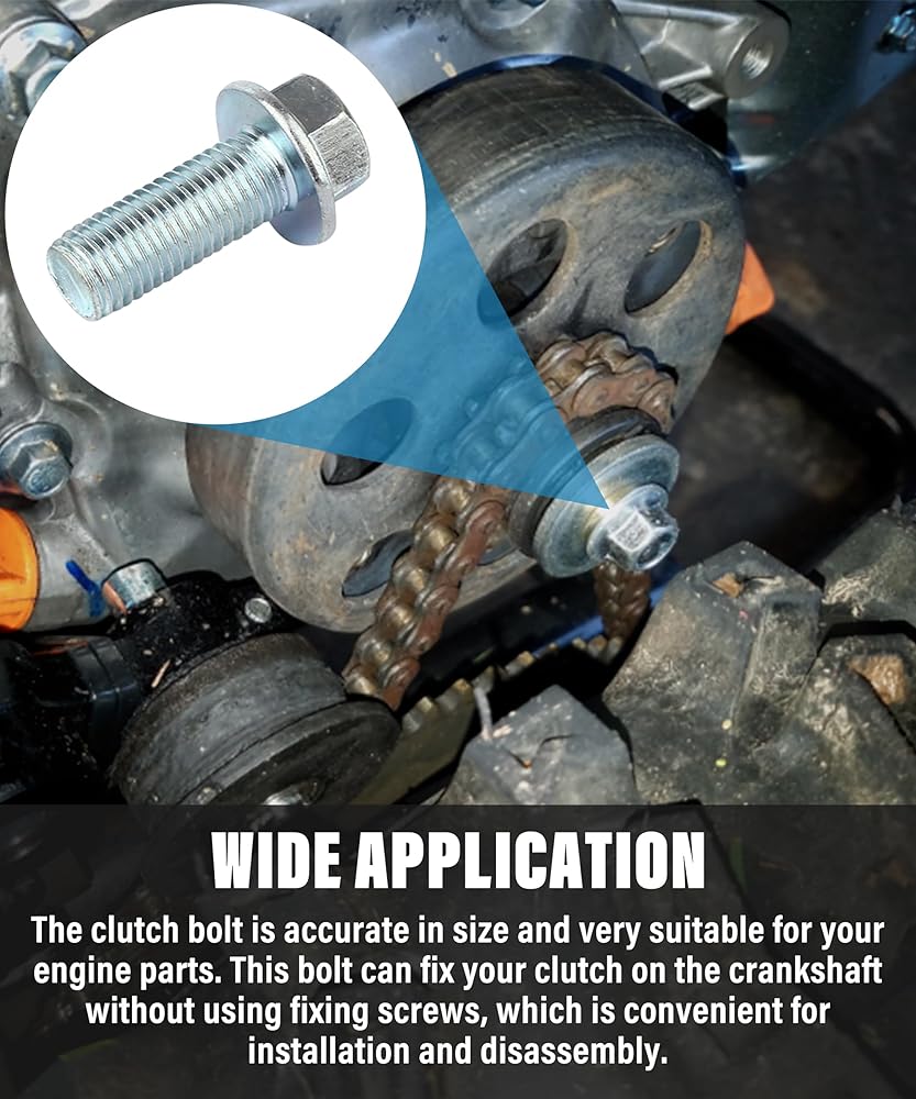 [Package Includes]The package includes 2 sets of kart clutch bolt kits, each set including 1 screw, 1 washer, and 1 lock washer.