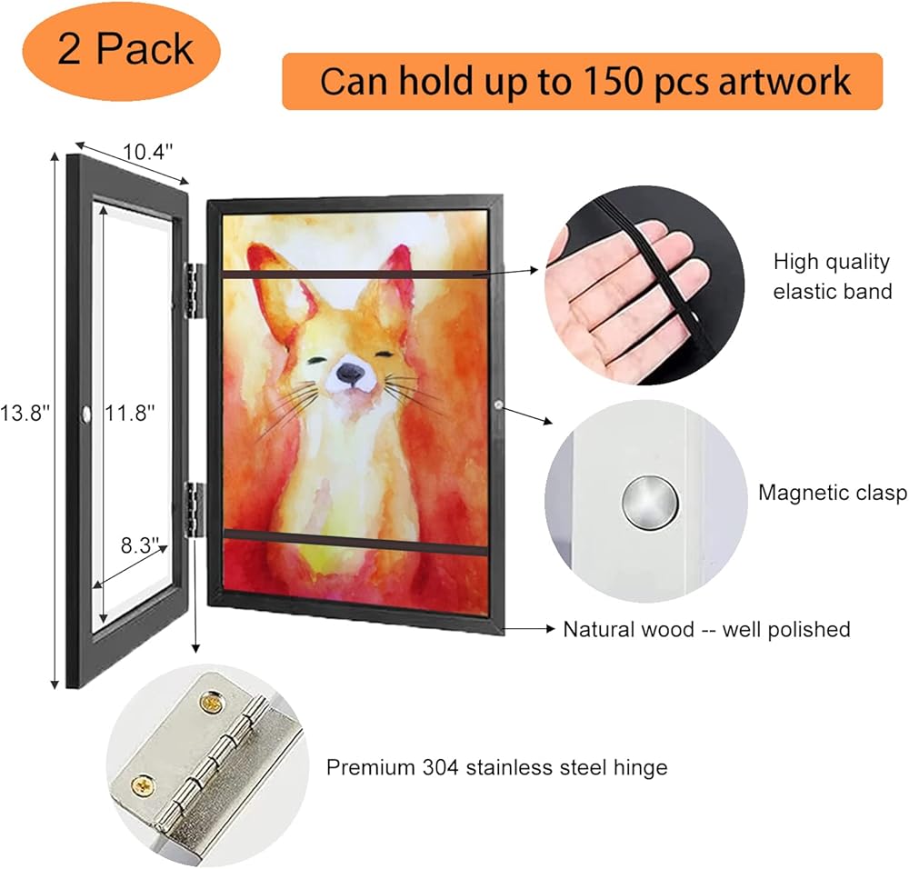 Package includes: 2 * kids artwork frame. The kids artwork frame with storage is perfect for your kids' cherished artwork like paintings, pictures, photos, school artwork. These picture dispaly frames open like a book and the elastic straps on the interior allow your kids to store their artwork easily.