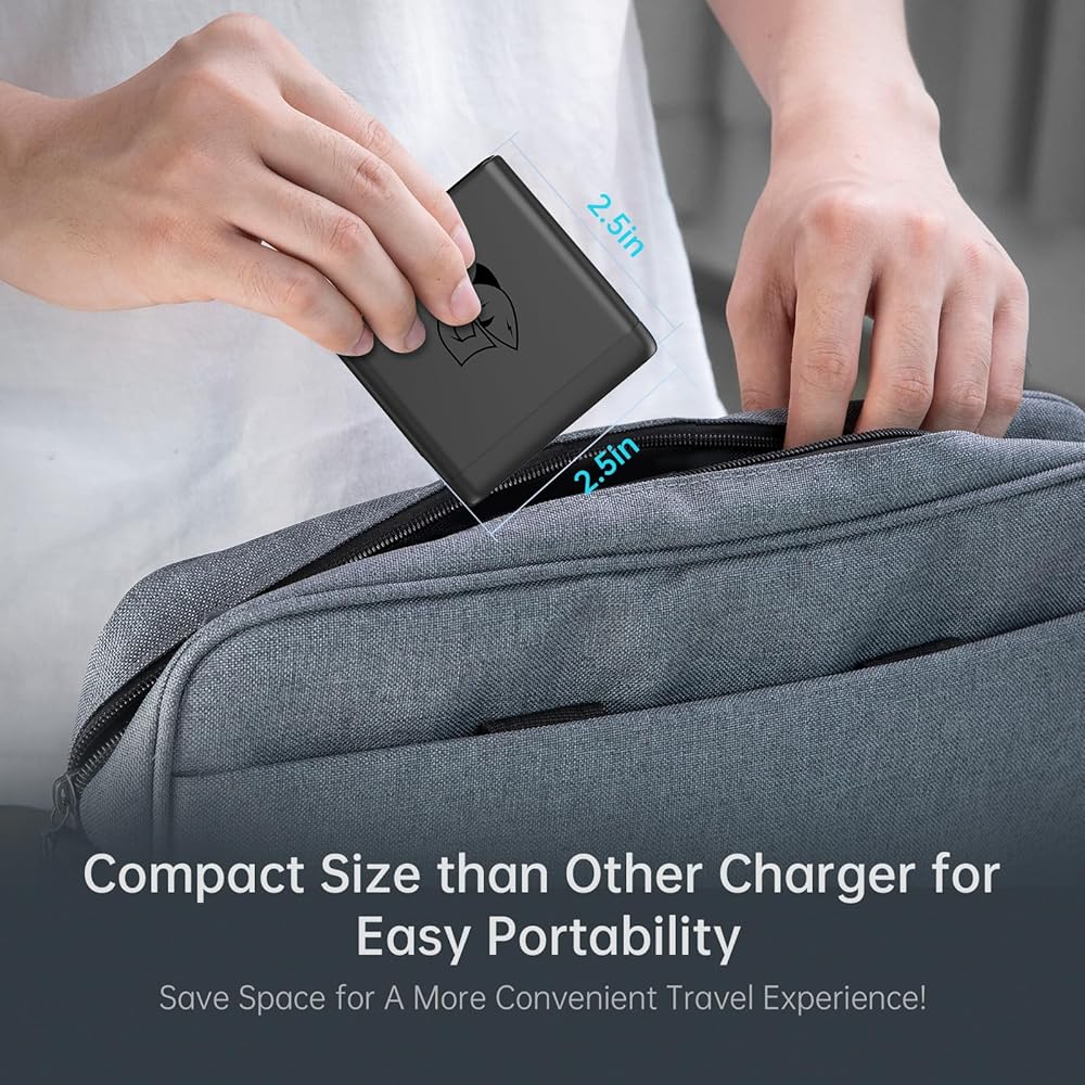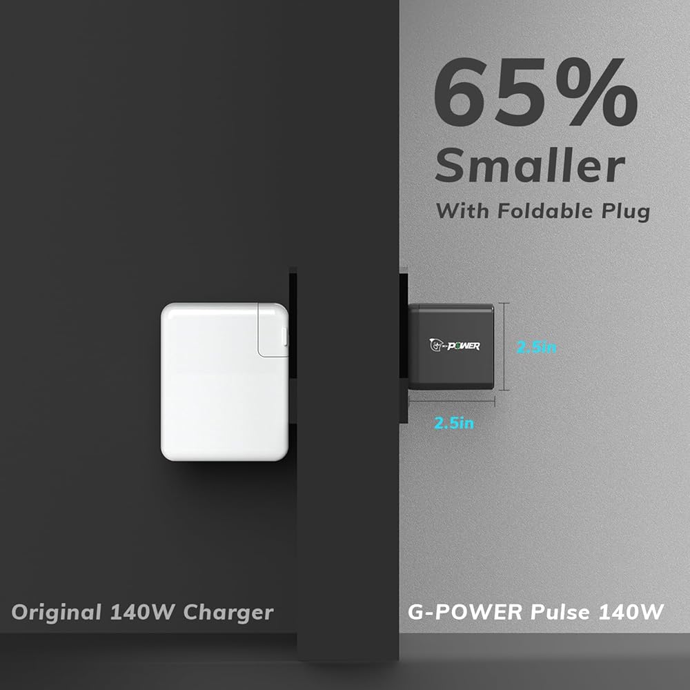 📏 تصميم مضغوط للغاية: يوفر الشاحن الخاص بنا الطاقة الكاملة، وهو أصغر بنسبة 65% من شاحن Apple الأصلي بقدرة 140 واط، مما يجعله الخيار الأكثر إحكامًا وقوة المتاح.