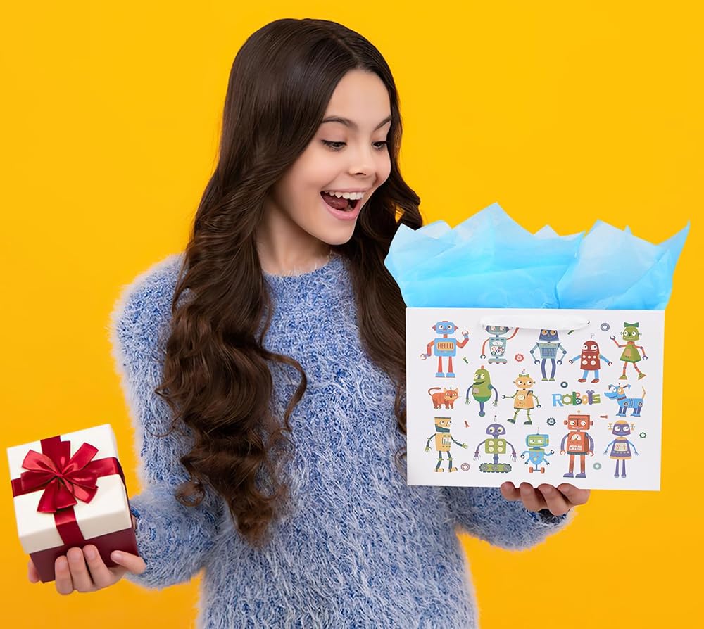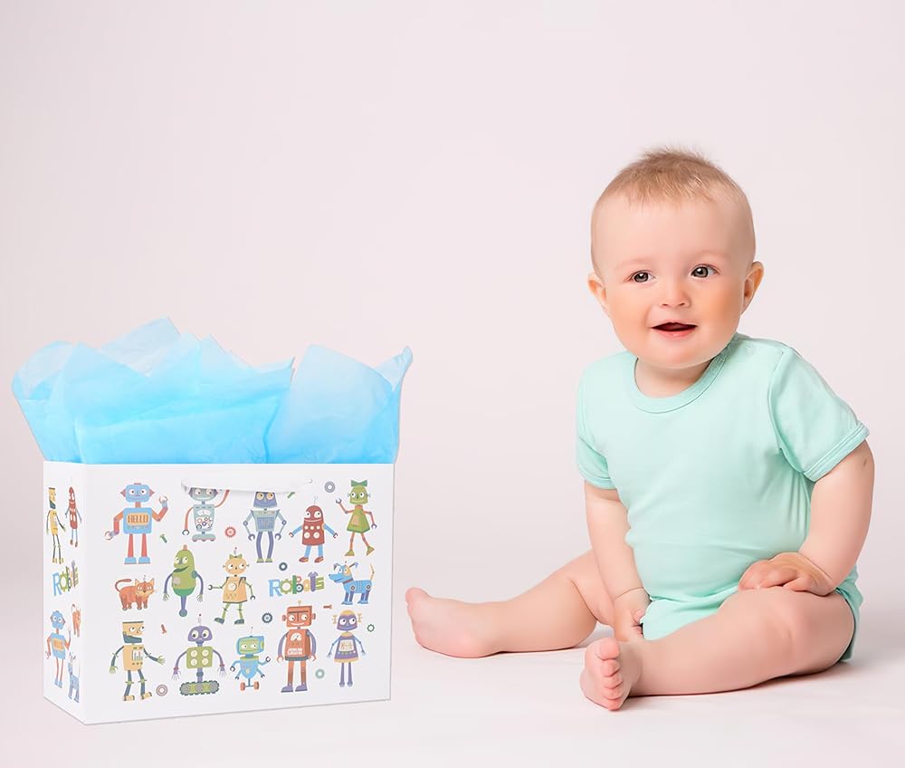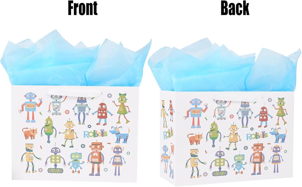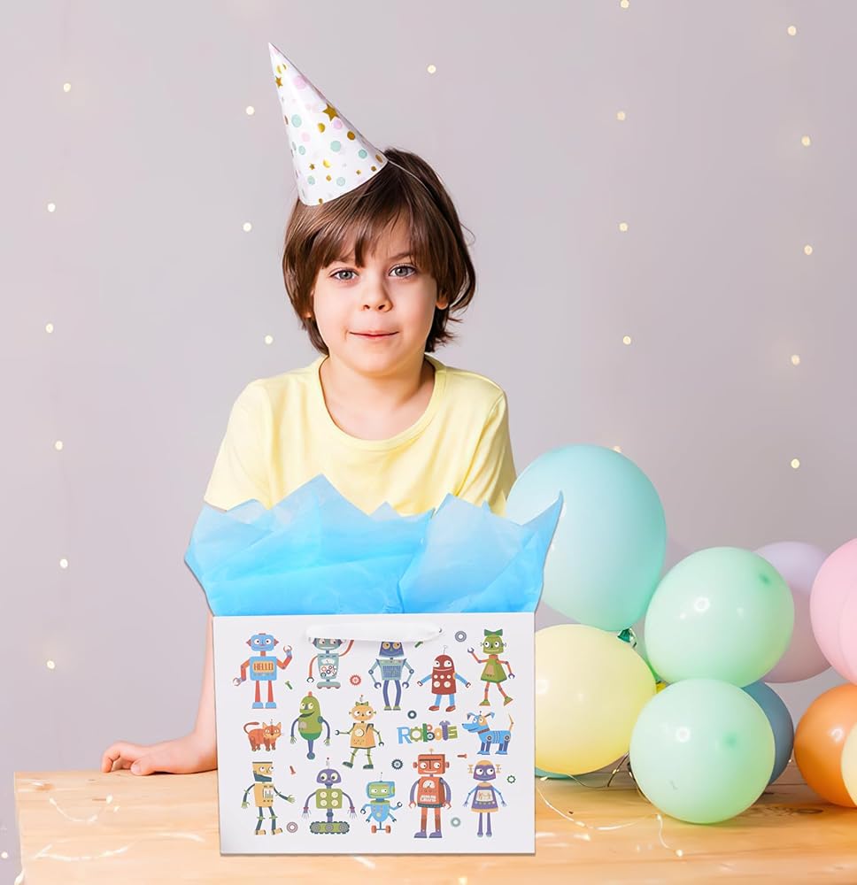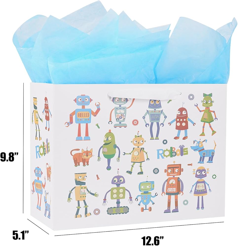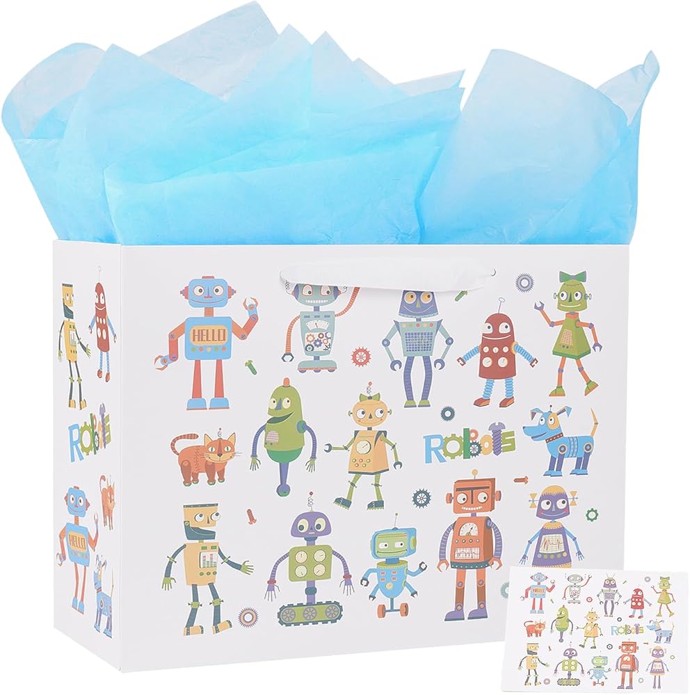 حقيبة هدايا كبيرة من ysmile مع مناديل تغليف للطفل الصبي، عيد ميلاد سعيد للأطفال مقاس 12.6 بوصة لحديثي الولادة - روبوت كرتوني
