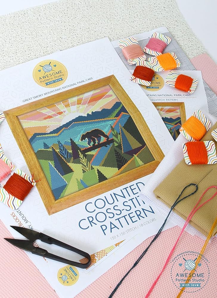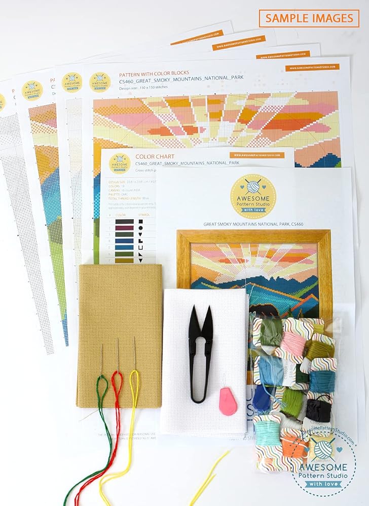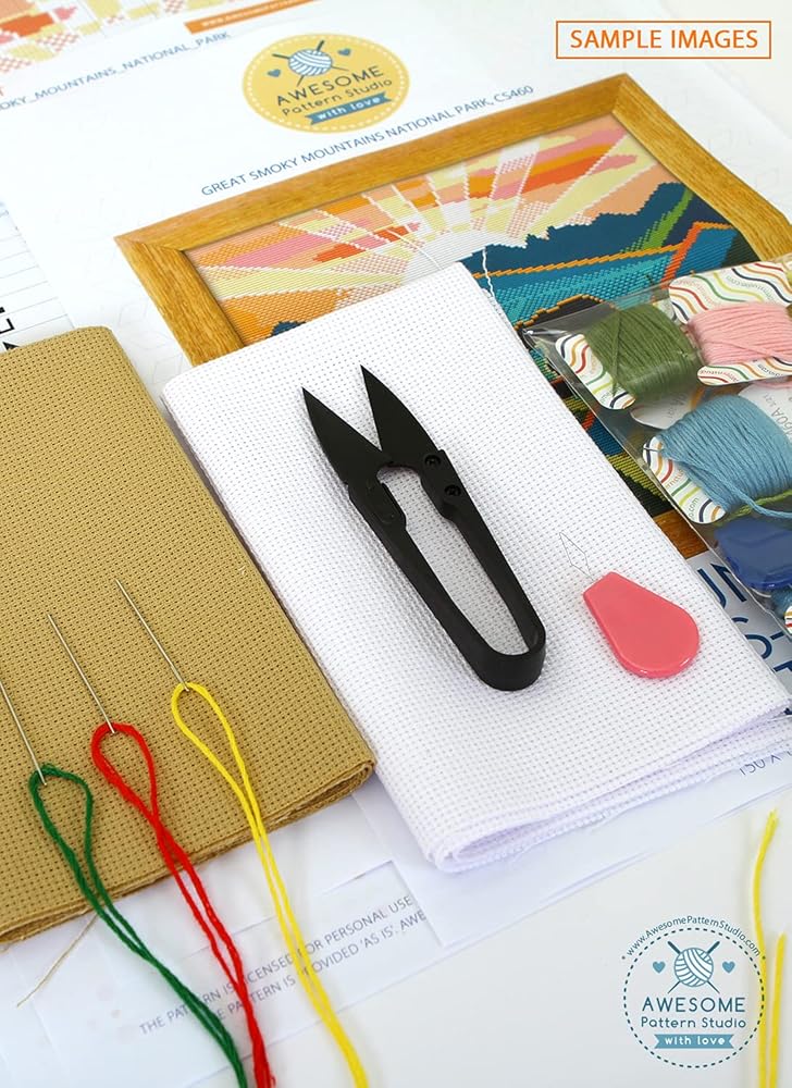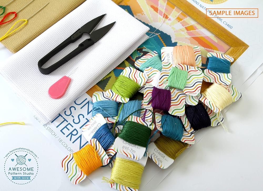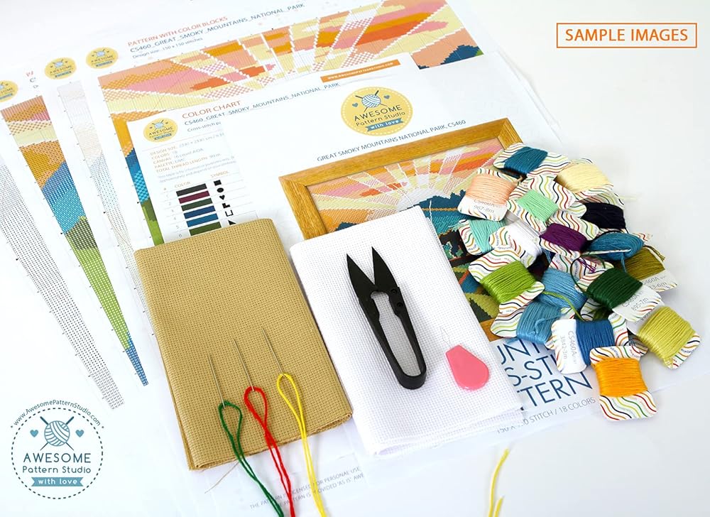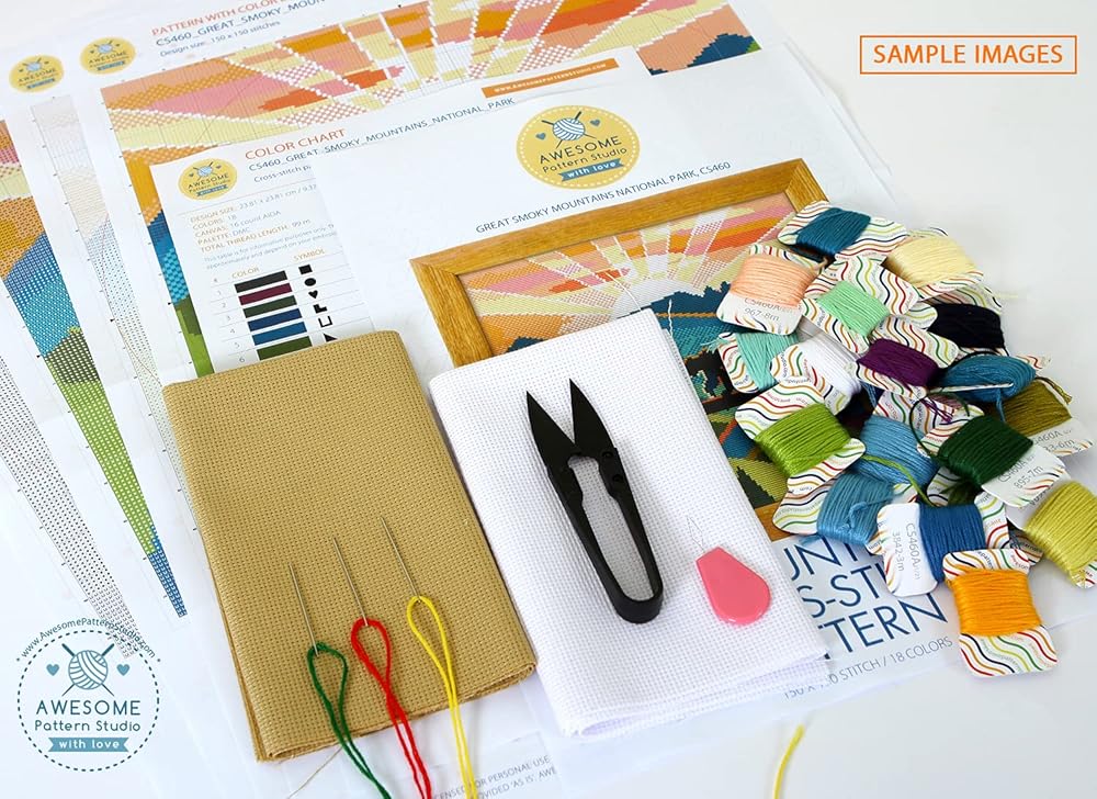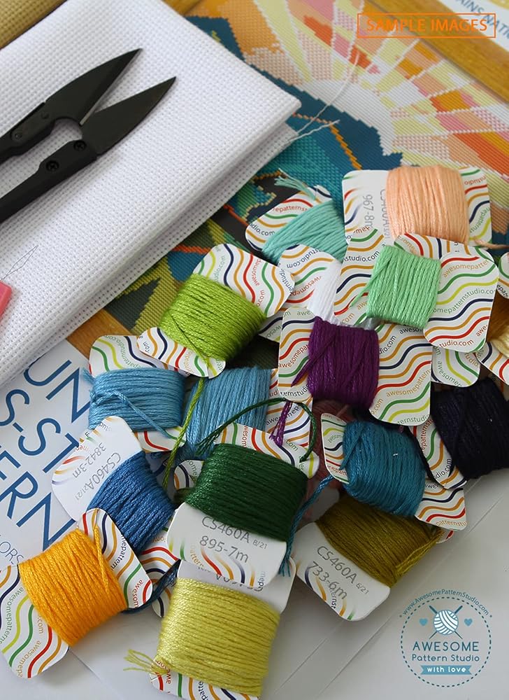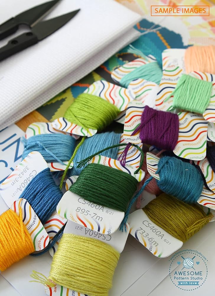 Includes: Set of Threads, 3 x Needles, White and Beige 14 count AIDA fabric, 1 x Threader, 1 x clippers, 4 x Color printed patterns in A3 format paper