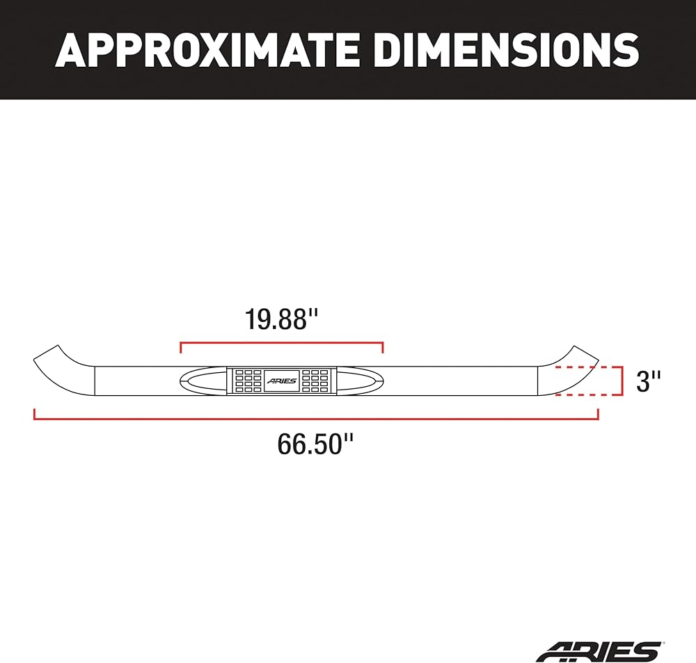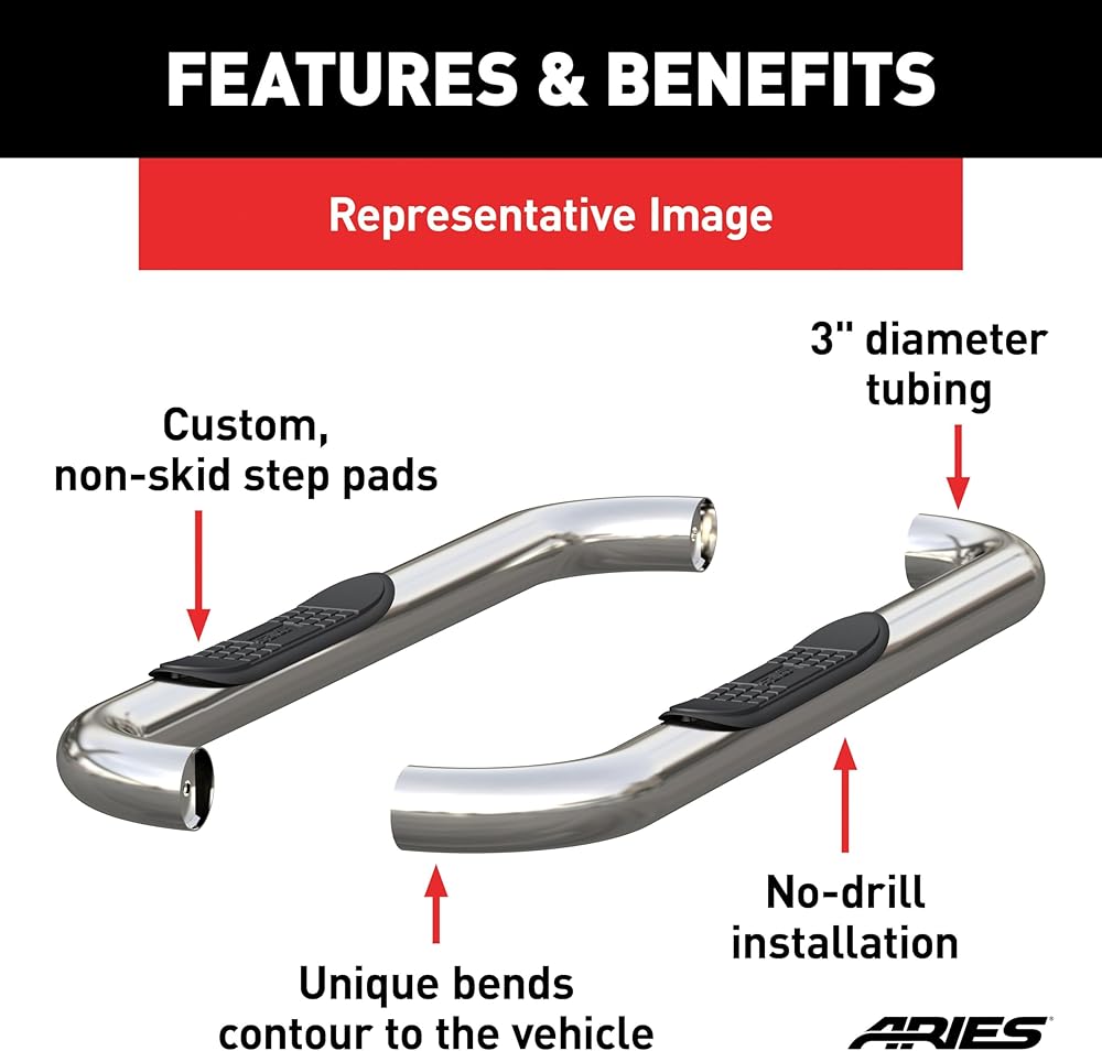 ARIES 3" side bars add a custom look and dependable footing to your truck, Jeep or SUV. They feature a classic style, a strong design and non-skid step pads. ARIES nerf bars are all made vehicle-specific for a custom, no-drill fit, and they are available in multiple finish options. This set of nerf bars is constructed from 304 stainless steel with a polished finish. Our 304 stainless steel is a true stainless with high nickel content, offering better corrosion resistance and a long-lasting finish. The polish is a triple application, resulting in a mirror-like shine to complement your vehicle. ARIES 3" round side bars also come with high-strength steel brackets and non-skid step pads. The mounting brackets -- as well as the side bars and step pads -- are custom-designed for specific makes and models to allow the nerf bars to contour to the lines of your vehicle. This ensures easy, no-drill installation and the strength necessary to provide solid footing. This particular set of custom nerf bars fits specific years of the Chevy or GMC C2500, C3500, K2500 and K3500 (see application info to verify fitment). ARIES 3" round side bars also come with non-skid step pads made of polypropylene. These wide, custom-positioned step pads feature a textured pattern and cover a wide portion of the tubes to be more comfortable and high-traction, even in wet conditions.