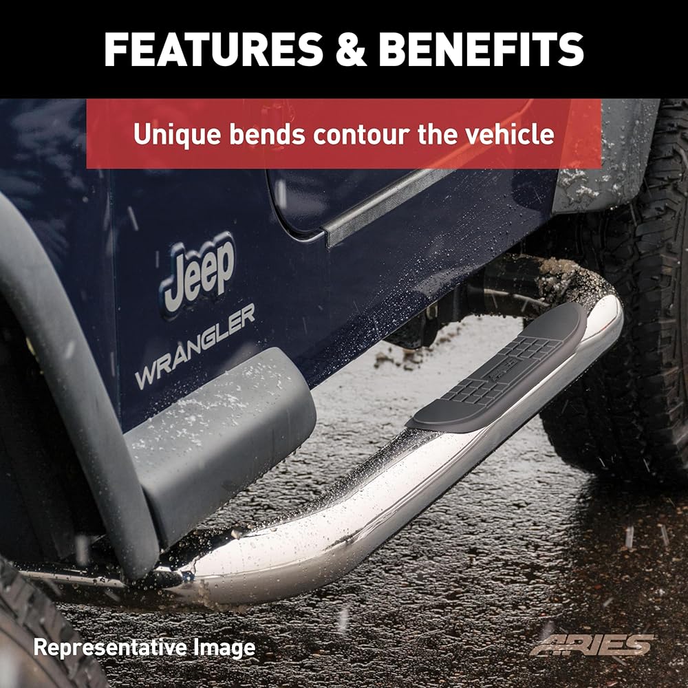 CUSTOM CONTOURS. Each set of ARIES 3-inch nerf bars is custom-bent to contour to each unique vehicle body, adding functional footing and accenting your ride with aftermarket style