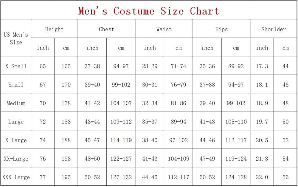 XXX-Large: height 73", chest 47-48", waist 39-40", hip 49-52"