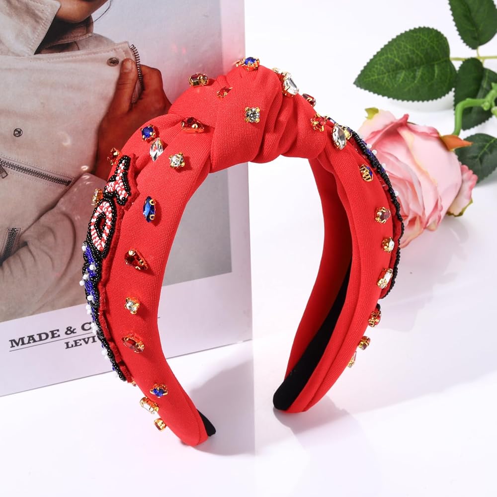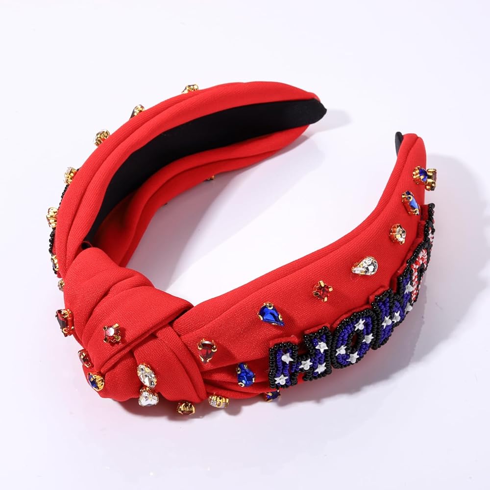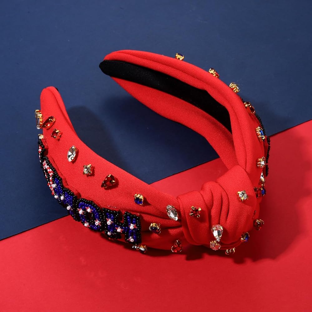 4th of July Knot Headband for Women Red White Blue Star Hairband Pearl Rhinestone Stars Beaded USA Patriotic Knotted Head Band Headpiece Hair Accessories