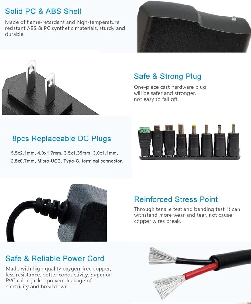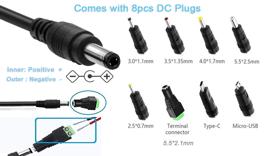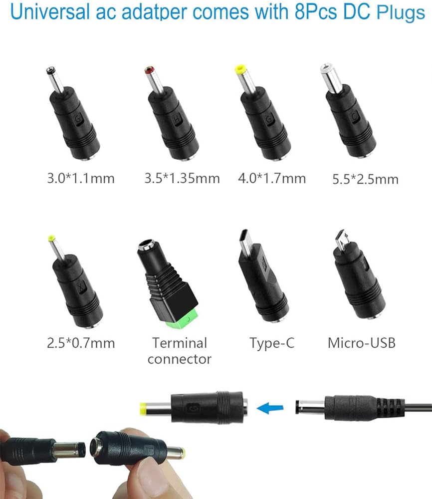 يأتي محول التيار المتردد العالمي مزودًا بمقابس تيار مستمر 8x: يمكنك تنفيذ مشاريع المحولات بنفسك واستخدامها لمزيد من الأجهزة الإلكترونية المنزلية بجهد 3 فولت. أبعاد النصائح: 5.5 × 2.1 مم، 5.5 × 2.5 مم، 4.0 × 1.7 مم، 3.5 × 1.35 مم، 3.0 × 1.1 مم، 2.5 × 0.7 مم، Micro-USB، نوع C، موصل طرفي. مما يوسع نطاق تطبيق المحول إلى حد أكبر. يرجى إعادة التأكد من حجم مقبس التيار المستمر قبل الشراء والاستخدام لضمان التوافق.