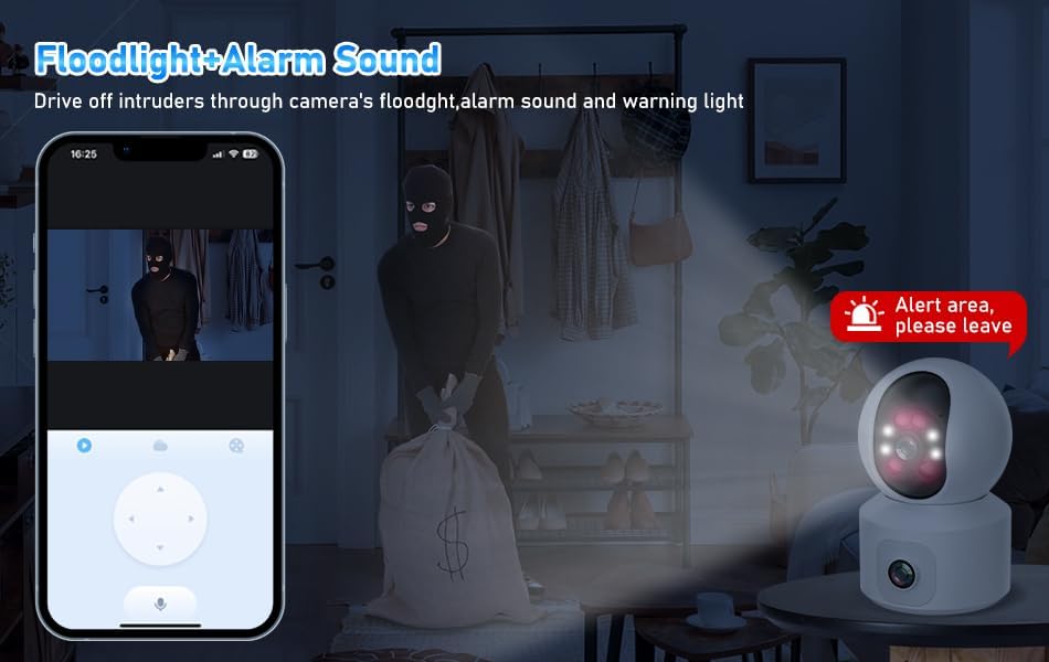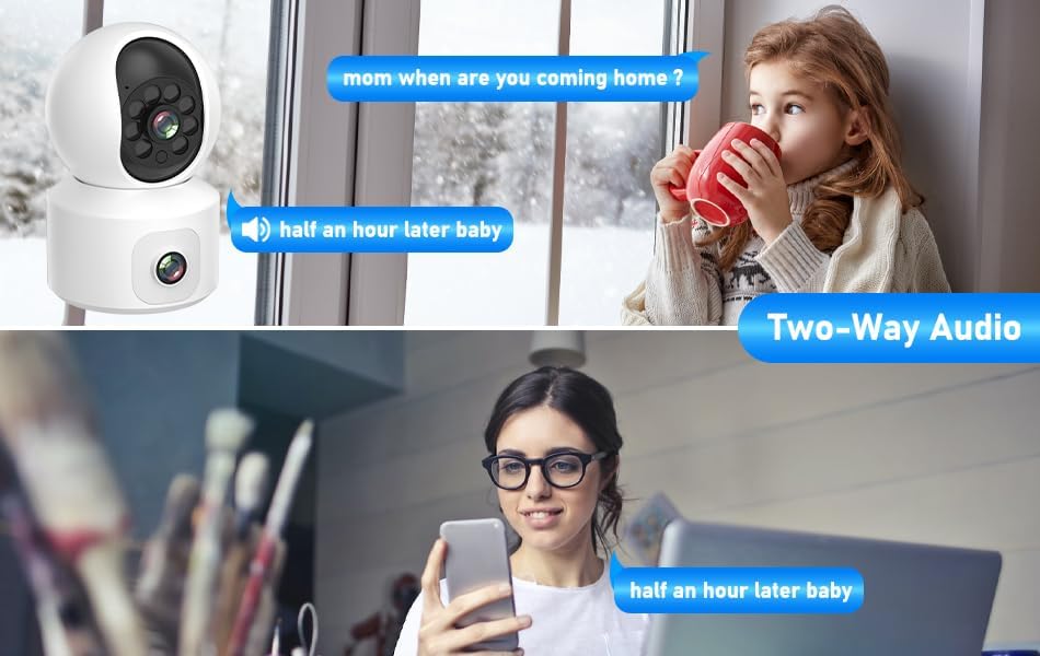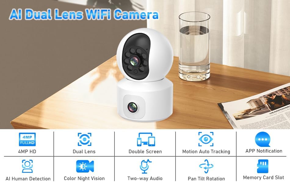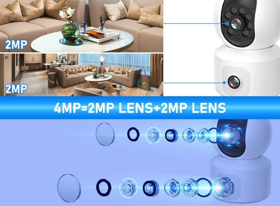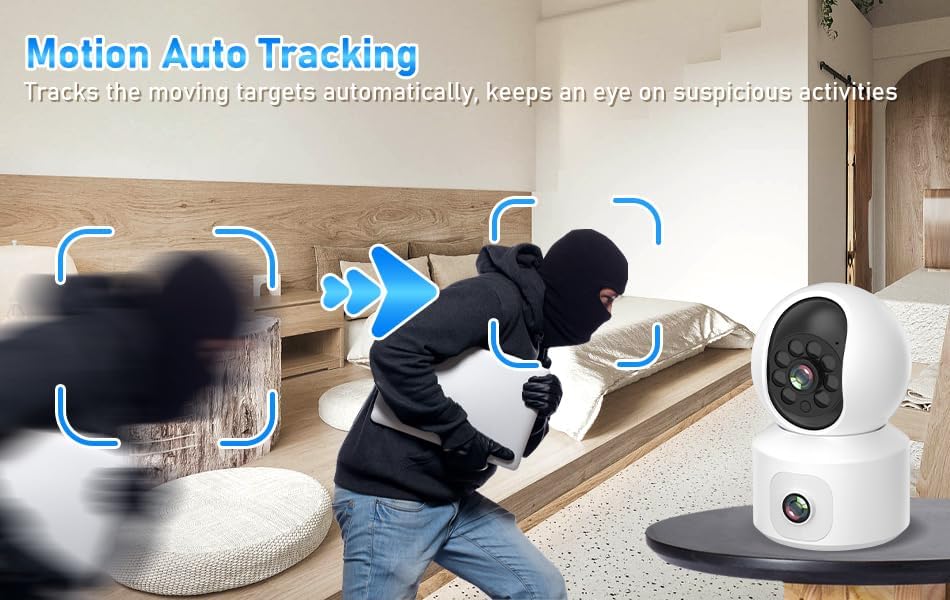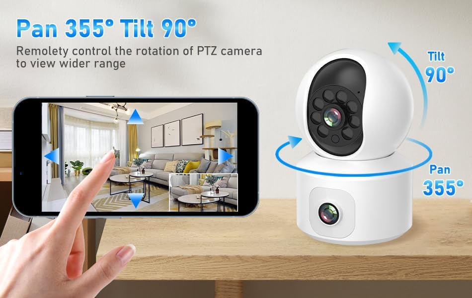 【عدسة مزدوجة وPTZ 360 درجة】باستخدام الكاميرا الداخلية ذات العدسات المزدوجة، يمكن مراقبة صورتين في نفس الوقت، مثل العدسة الثابتة لعرض غرفة المعيشة، وكاميرا PTZ لعرض المطعم، وهي مجهزة بـ وظيفة التتبع التلقائي، والتي يمكن أن تدور 355 درجة أفقيًا، و90 درجة لأعلى ولأسفل، و360 درجة. يتيح لك مجال الرؤية الكبير التقاط كل تفاصيل المشهد بسهولة وتحقيق أمان منزلي شامل.