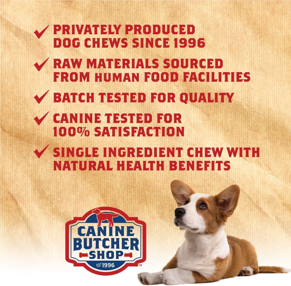 Canine Butcher Shop has been manufacturing the highest-quality dog chews since 1996 and coined the phrase, “always and only in the USA”. Our roots are in the meat industry making USDA meat products. We use the same practices and techniques in our dog chew operation to make the highest quality, wholesome dog chews possible. Our raw materials are tested for quality and 100 percent natural, with no added salt, sugar, flavors, preservatives, or coloring. Our products are made to satisfy dogs' natural urge to chew, while cleaning teeth and gums. All products are handmade “always and only in the USA”. Our chews have zero additives and will satisfy your dog's desire to bite and chew. With either one or two natural ingredients, our unique variety offers a gratifying taste during any chew-session.