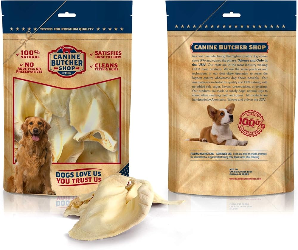 SINGLE INGREDIENT, LARGE, WHOLE COW EARS. Zero salt, sugar, flavors, coloring, additives or preservatives. Each batch is tested for quality and safety in an independent, third party laboratory.