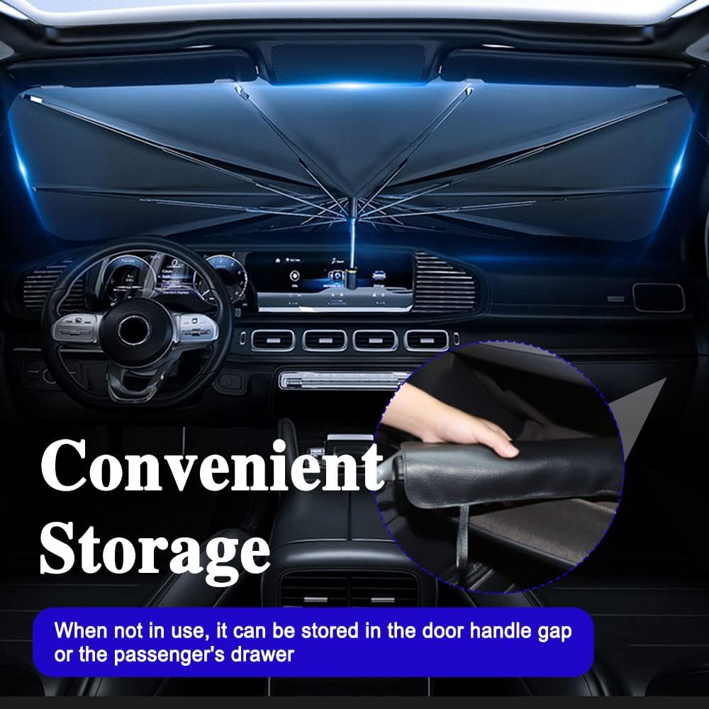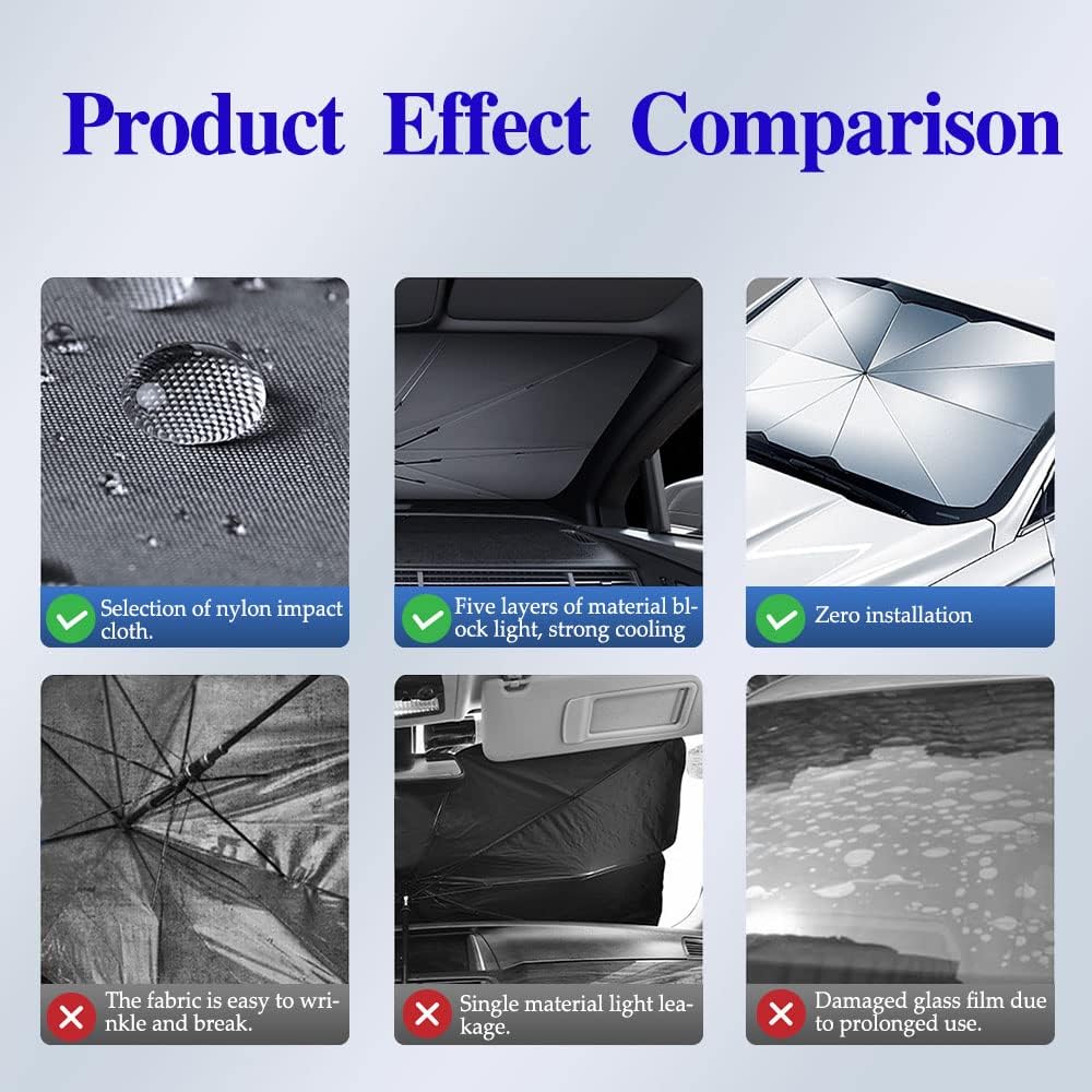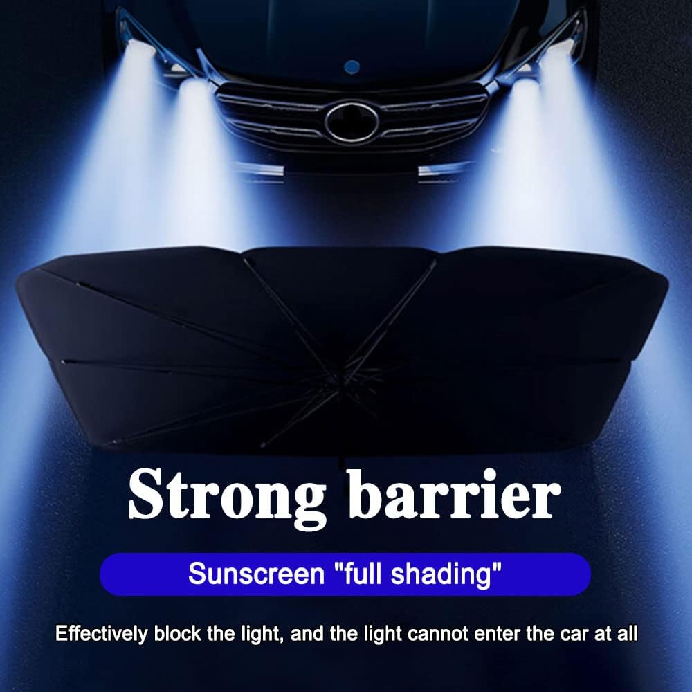 [Durable material and firm structure]: The front windshield umbrella of this car is made of alloy material, equipped with 10 solid frames and stable supports, which ensures the durability of the windshield sunshade of this car.