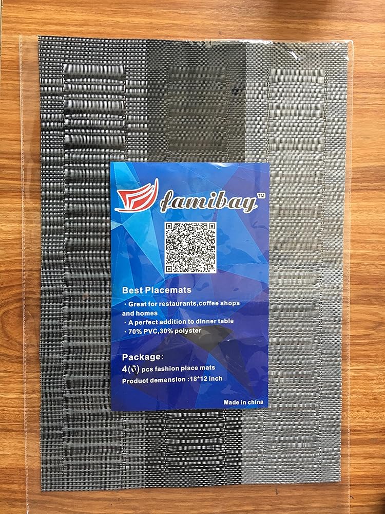 • العبوة: تأتي كل عبوة في 4 قطع من مفارش الأطباق (12 × 18 بوصة) وقطعة واحدة من مفرش الطاولة (12 × 70.8 بوصة)