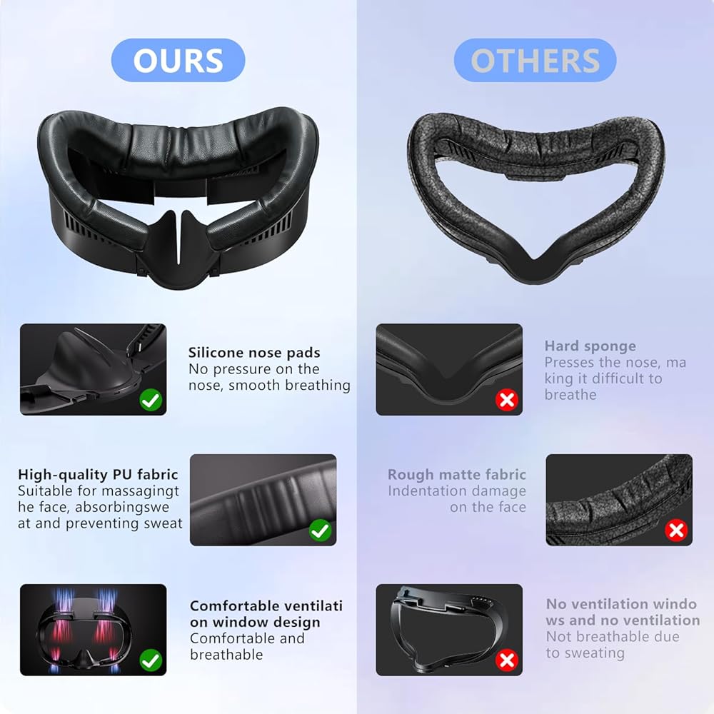 【Immersive Gaming Experience】Does great to use high-tech design to prevent light loss so makes a more immersive gaming experience during gaming. Made with waterproof PU surface facial pad and sponge foam, it is softer, more comfortable and sweat-proof, so you no longer have to worry about allergies or fading, and it no need special care;