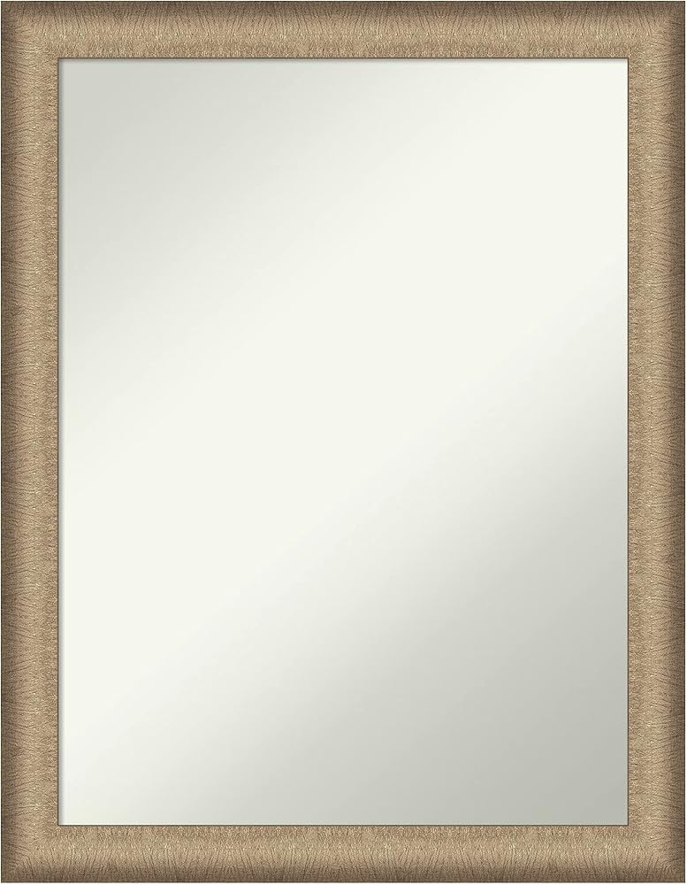 PRODUCT: Amanti Art Non-Beveled Bathroom Wall Mirror; OUTER SIZE: 42.5 x 31.5 inches; FRAME: Trio Oil Rubbed Bronze 2.5"; FRAME FINISH: Oil Rubbed Bronze; FRAME COLOR: Bronze. The Trio Oil Rubbed Bronze frame features an espresso brown frame with bronze brushstrokes and edges with the look of oil-rubbed bronze. Give your bathroom the finishing touch with this framed wall mirror. Individually made using traditional custom framing techniques, it has the quality you would expect from your local frame shop. It holds its value with premium finishing that can be appreciated up close. Because of our attention to detail and focus on artistry, architects, interior designers, and homeowners alike choose this mirror to create beautiful living spaces.