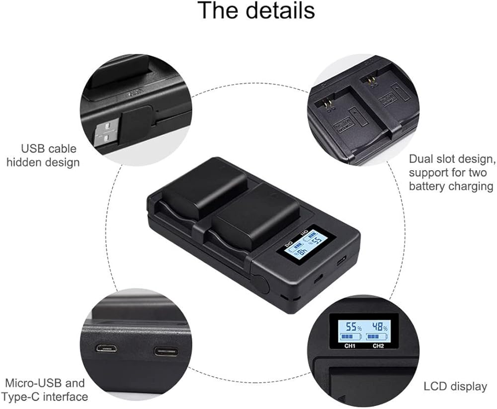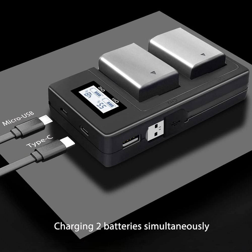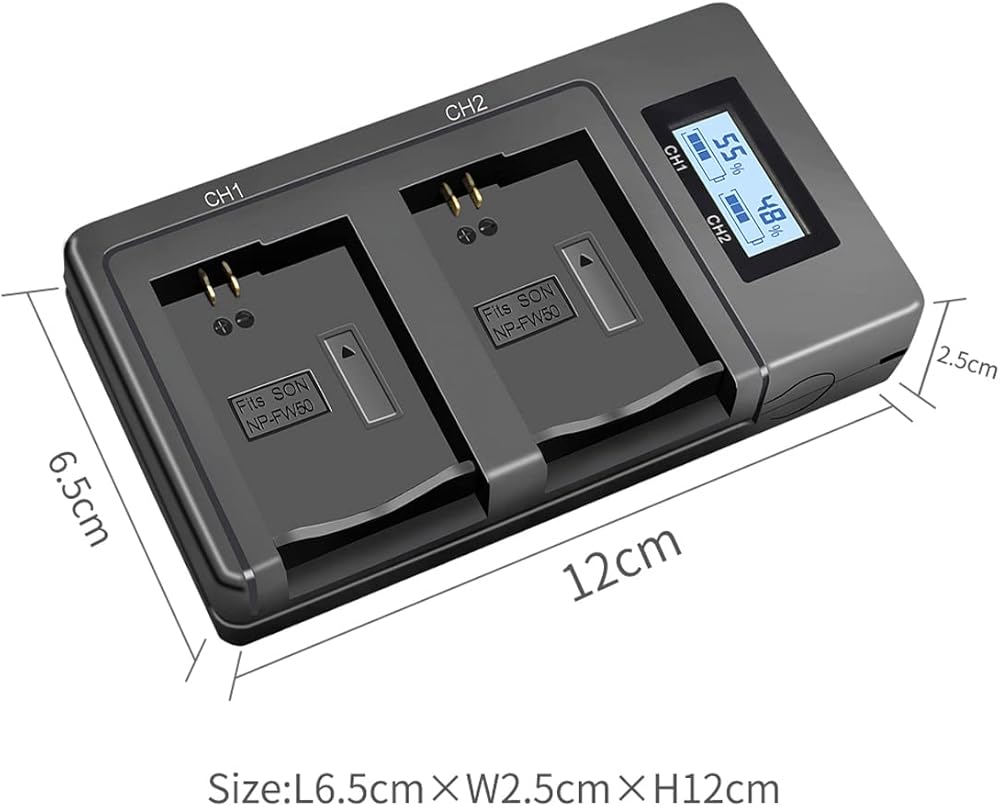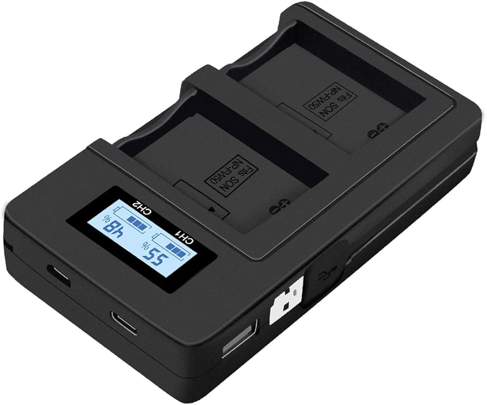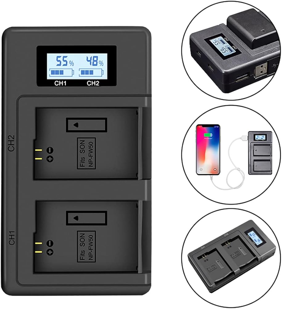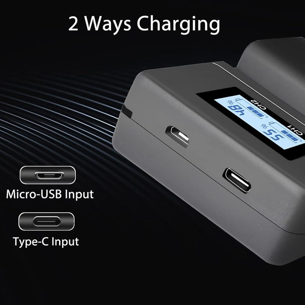 كفاءة عالية: يمكن لشاحن البطارية NP-FW50 ذو الفتحة المزدوجة شحن بطاريتين في وقت واحد، مما يوفر وقت الشحن بشكل فعال. يحتوي على مدخل Micro USB وUSB C، ومخرج USB، ما عليك سوى الاتصال بجهاز الكمبيوتر المحمول الخاص بك، ومحول السيارة، وبنك الطاقة وما إلى ذلك. خيارات أكثر من شاحن البطارية القياسي. يعمل مدخل 5 فولت 2.1 أمبير على تحسين كفاءة الشحن ويستغرق 1.5 ساعة فقط لشحن بطاريتين بالكامل في وقت واحد. تعمل كل فتحة شحن بشكل مستقل.