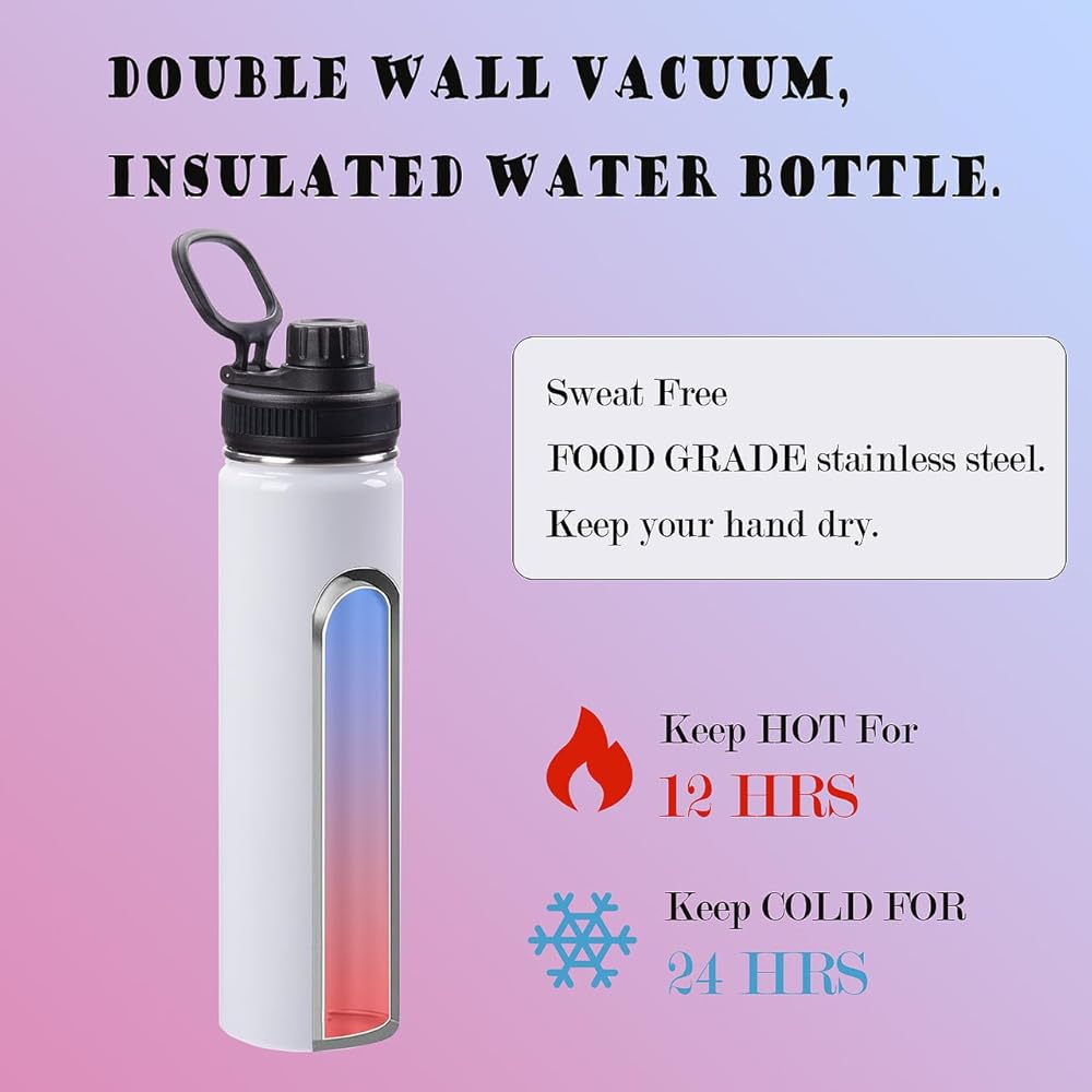 【جدار مزدوج - لا يتعرق】عزل الفراغ يحافظ على البرودة لمدة 24 ساعة والحرارة لمدة 12 ساعة. حتى لو كانت زجاجة الماء مملوءة بالثلج أو الماء المغلي، فإن الجدار الخارجي لزجاجة الماء لن يتعرق أو يسخن!