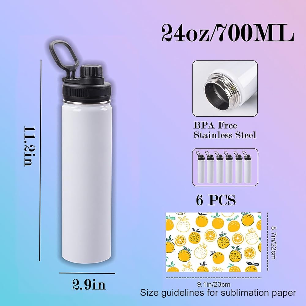 【مجموعة من 6 زجاجات مياه قابلة لإعادة الاستخدام】24 أونصة/700 مل، 2.9 × 11.2 بوصة (عمق × ارتفاع). مصنوعة من الفولاذ المقاوم للصدأ 18/8 الخالي من البيسفينول A، صديقة للبيئة، بدون رائحة، آمنة لترطيبك اليومي.