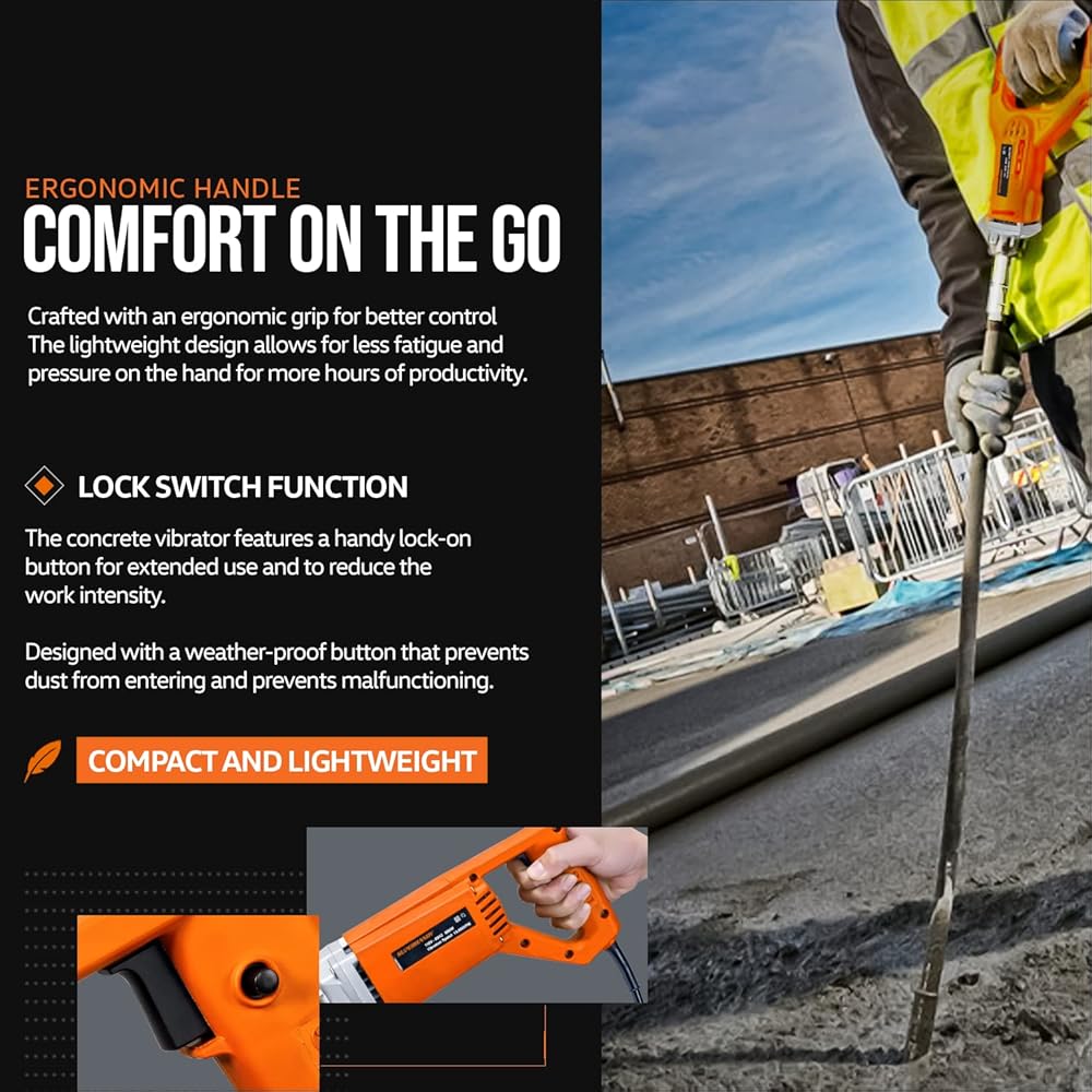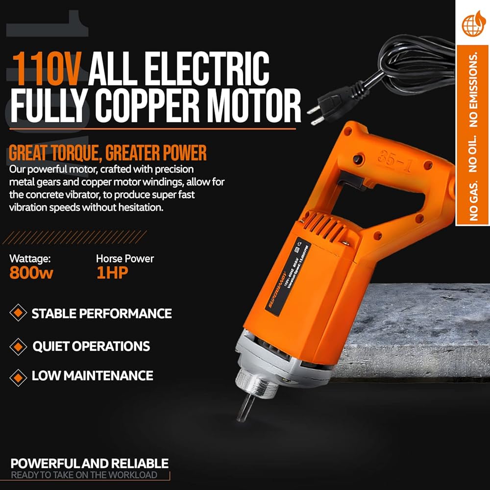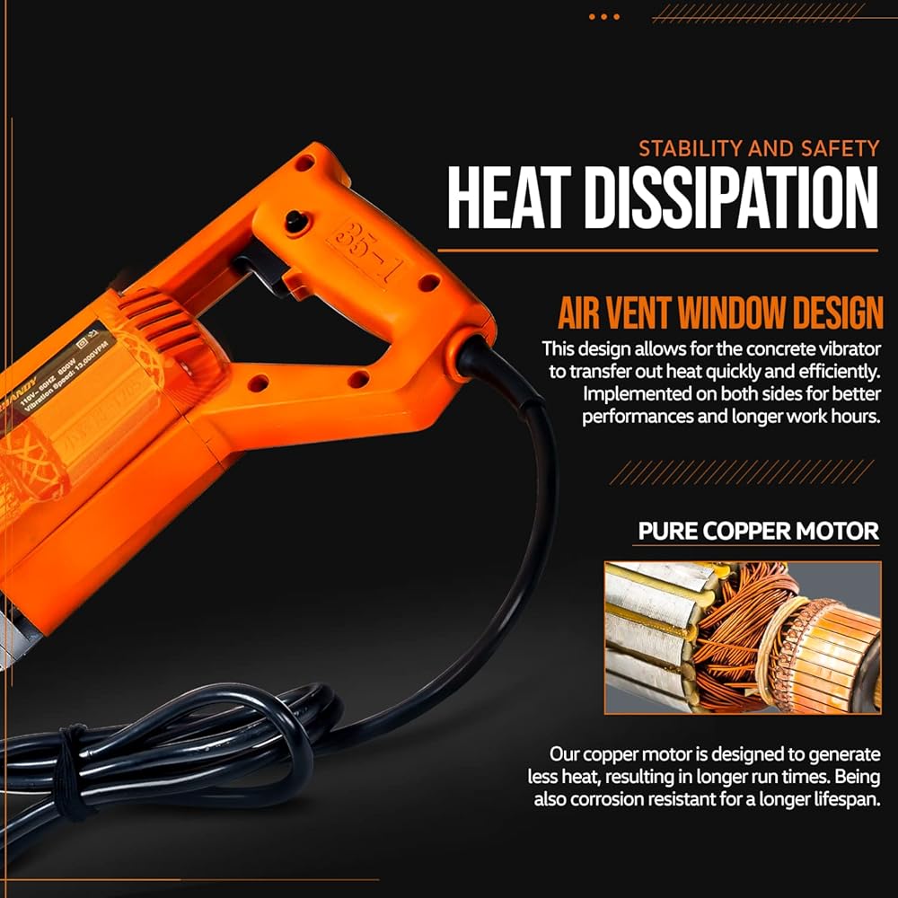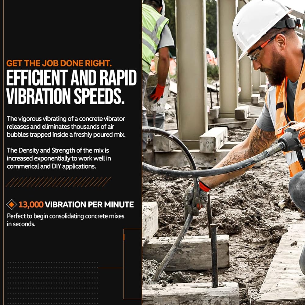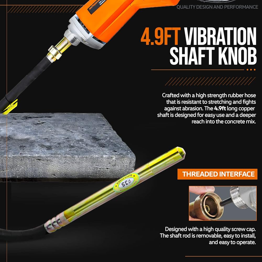 مواصفات عالية الأداء - تعمل بسرعة 4000 دورة في الدقيقة مع اهتزاز سريع التردد فعال يبلغ 13000 ذبذبة في الدقيقة (اهتزازات في الدقيقة)؛ طول العمود 4.9 قدم (1.4 متر) وطول الرأس الاهتزازي 15-1/8 بوصة وقطر رأس القضيب 1-3/8 بوصة (35 مم) (ملاحظة: اضغط برفق على رأس القضيب على جسم صلب ل جعل تردد اهتزاز العمود يتطابق مع الهزاز أثناء بدء التشغيل)