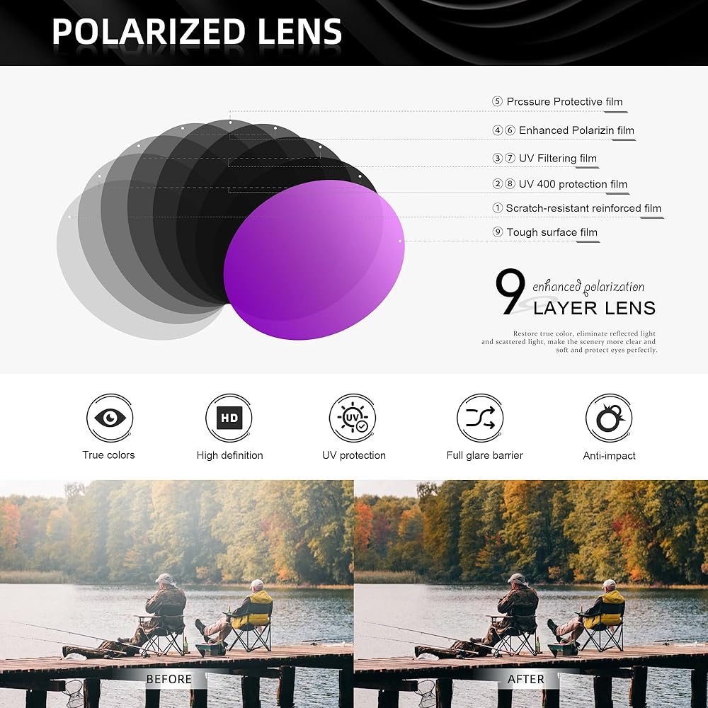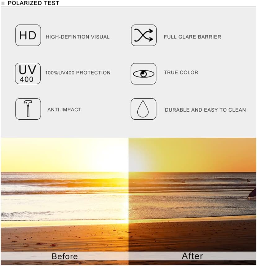 REFLECTIVE POLARIZED LENS: 100% UV400 protection from harmful UVA / UVB rays. HD lenses, eliminates reflected light and stray light. Block harmful light, prevent glare light, reduce visual fatigue.