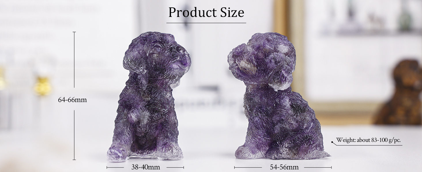 حجم تمثال الكلب الحجري: ارتفاع التمثال الحجري 2.51 بوصة - 2.59 بوصة (64-66 مم)، العرض 1.49 بوصة - 1.57 بوصة (38-40 مم)، السمك 2.12 بوصة - 2.2 بوصة (54-56 مم)؛ الوزن 83-100 جرام/قطعة. تشتمل العبوة على تمثال كلب من الحجر العلاجي المزخرف، وحقيبة هدايا مخملية حمراء وصندوق هدايا للحماية.