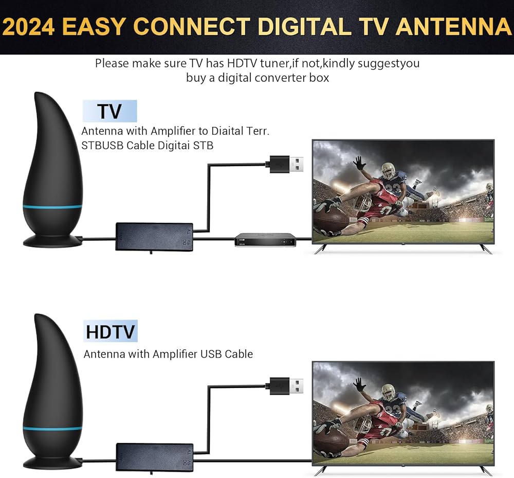 【Easy to Install】You can place TV antenna behind the TV or in front of the window, we ensure you can complete the installation in minutes. You can enjoy tons of channels in your living room, bedroom, basement, RV, and more with the HDTV antenna. If your TV has more than one built-in tuner, simply plug one end of each coaxial cable into each TV terminal and the other end of the antenna into each corresponding coaxial input on your TV's USB port.