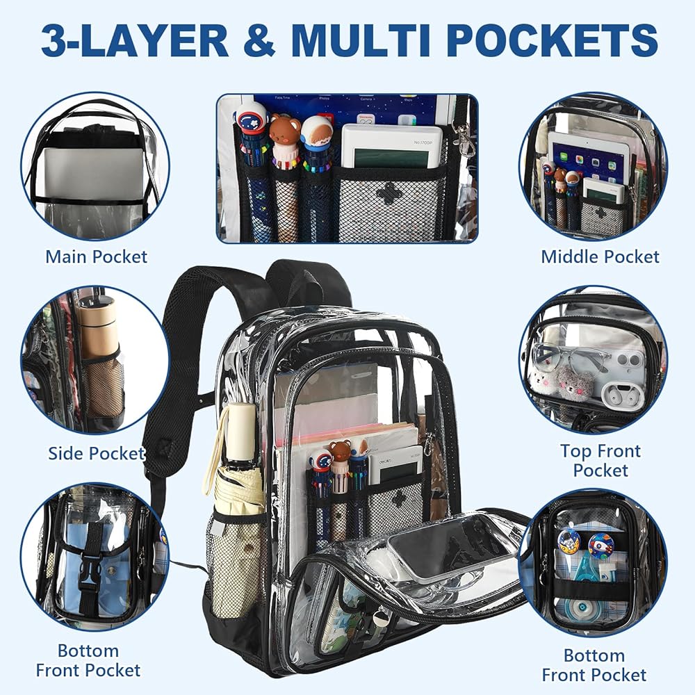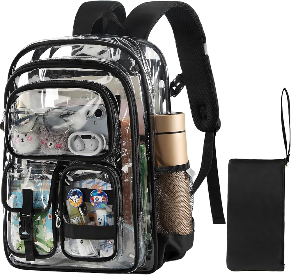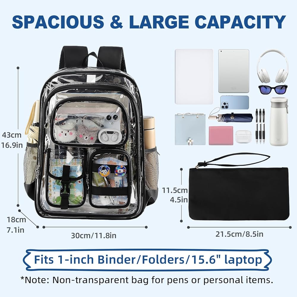 حقيبة ظهر واضحة ، حقائب الظهر الشفافة 17 بوصة مع إكسسوارات ، حقيبة مدرسية للفتيان المراهقين ، أكياس الكمبيوتر المحمول الصافية لدوائر النهار في المدارس الثانوية الابتدائية