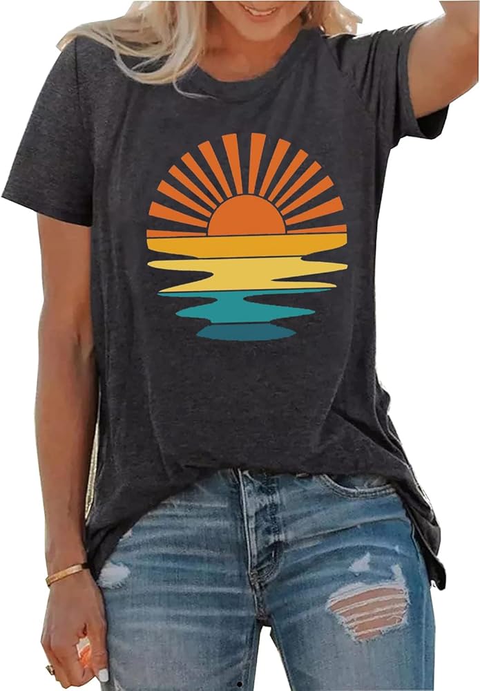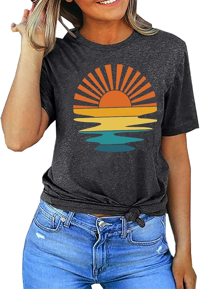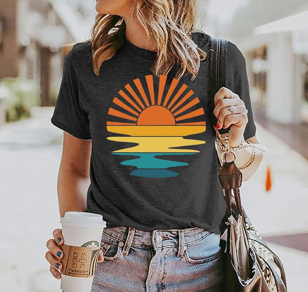 Retro Sunset Tshirt for Women Vintage Sunshine Graphic Tees Casual Summer Vacation Shirt Short Sleeve Beach Party Tops Blouse