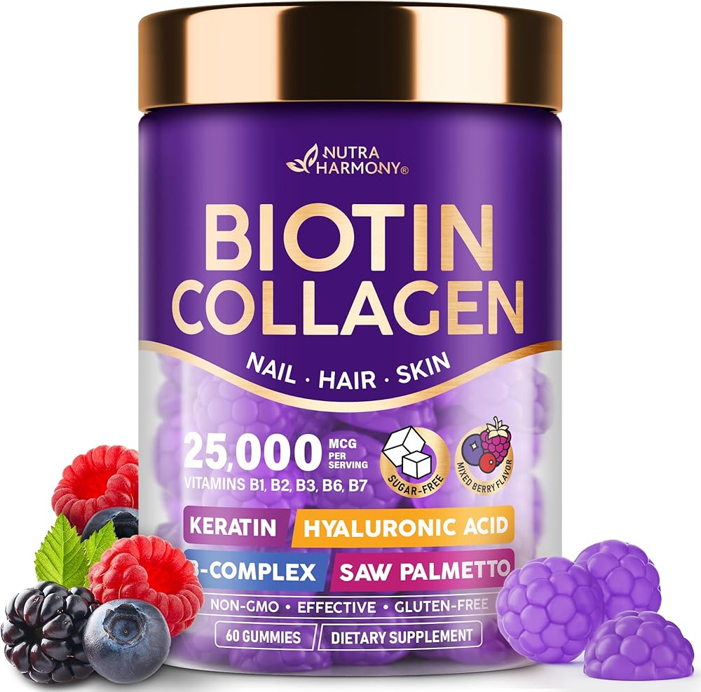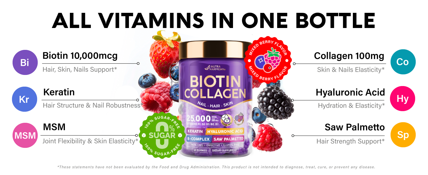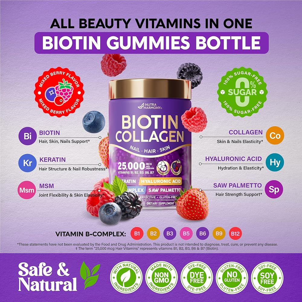 Biotin 10,000 mcg & Collagen Gummy - علكة فيتامينات الشعر اللذيذة والصحية لدعم جمالك المثالي! مجموعة فيتامينات الشعر والأظافر الخالية من السكر مع نكهة التوت المختلطة. تم تصميم علكات البيوتين لدعم الشعر القوي وتقوية الأظافر والجلد، مما يجعلها فيتامينات شعر مثالية للنساء والرجال!