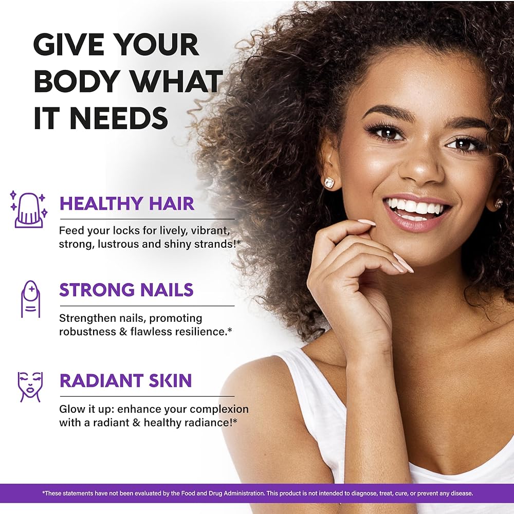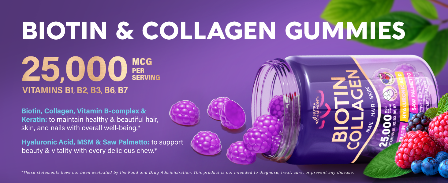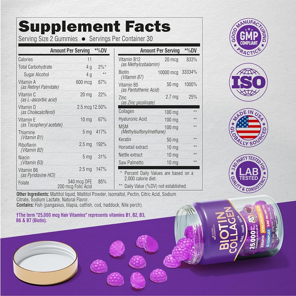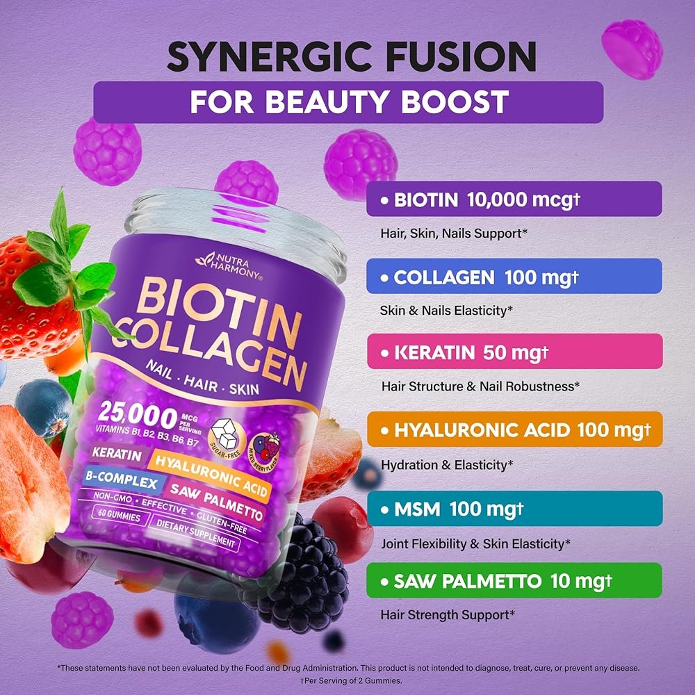 Biotin 10,000 mcg & Collagen Gummy - علكة فيتامينات الشعر اللذيذة والصحية لدعم جمالك المثالي! مجموعة فيتامينات الشعر والأظافر الخالية من السكر مع نكهة التوت المختلطة. تم تصميم علكات البيوتين لدعم الشعر القوي وتقوية الأظافر والجلد، مما يجعلها فيتامينات شعر مثالية للنساء والرجال!