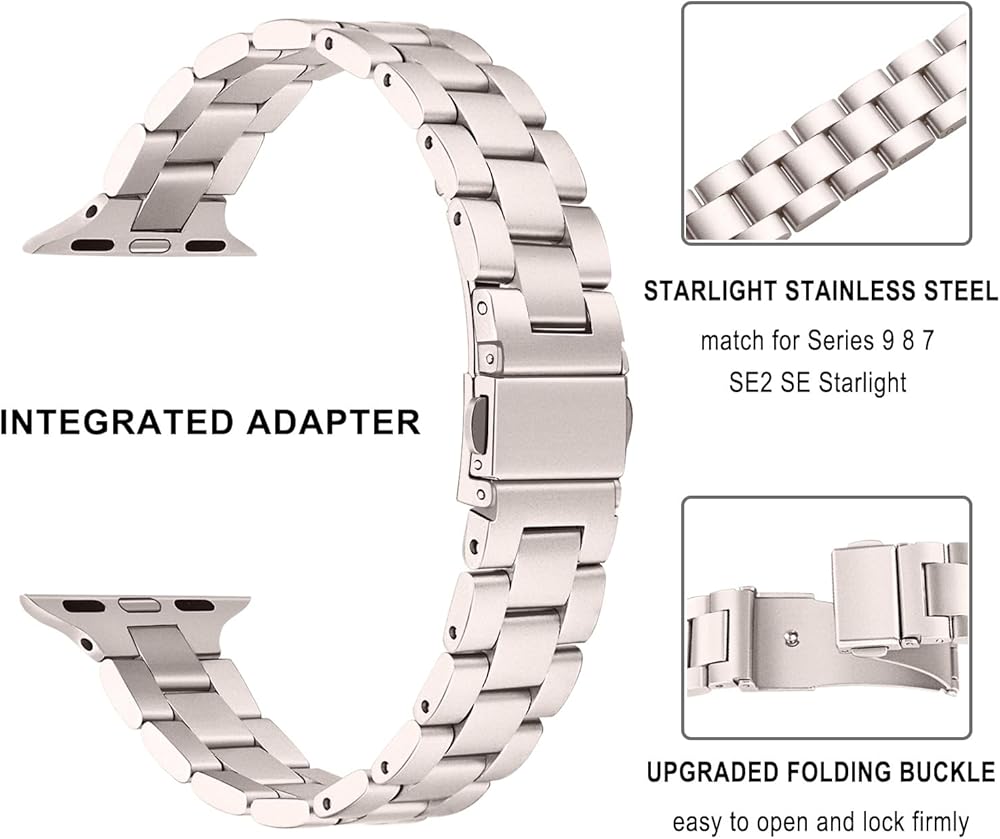 • الفولاذ المقاوم للصدأ بإضاءة النجوم: مصنوع من الفولاذ المقاوم للصدأ الصلب مع طلاء ناعم وطلاء كهربائي، ولون ضوء النجوم، وهو مطابق تمامًا للون سلسلة 9 8 7 SE Starlight Watch، متين ومريح. مشبك قابل للطي مطور، سهل الفتح والطي مع مشبك أمان إضافي.