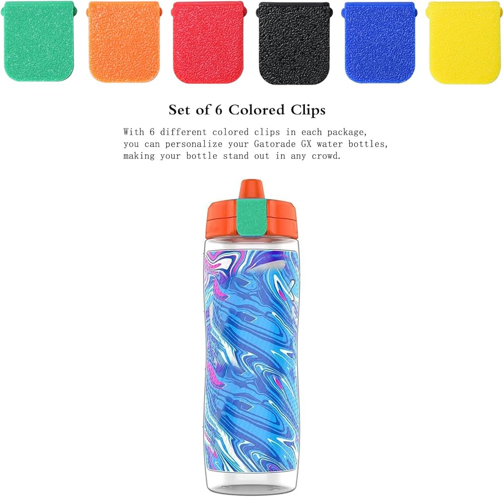 مجموعة من 6 مشابك ملونة: مع 6 مشابك ملونة مختلفة في كل عبوة، يمكنك إضفاء طابع شخصي على زجاجات المياه GX الخاصة بك، مما يجعل زجاجتك مميزة في أي حشد من الناس.