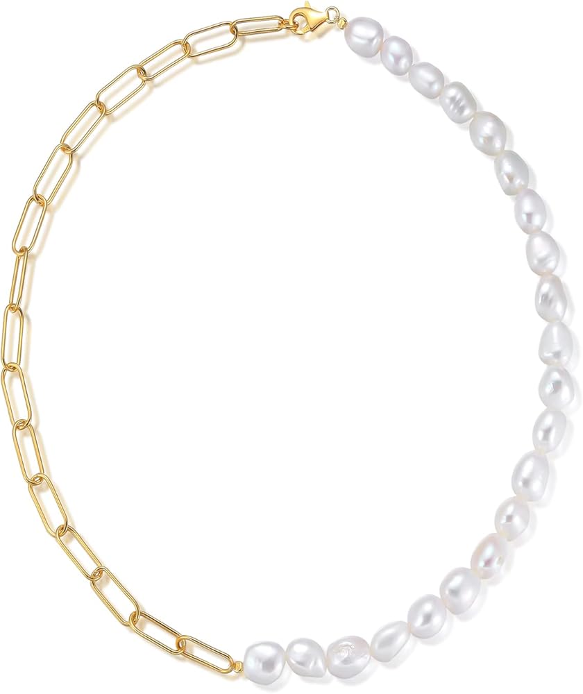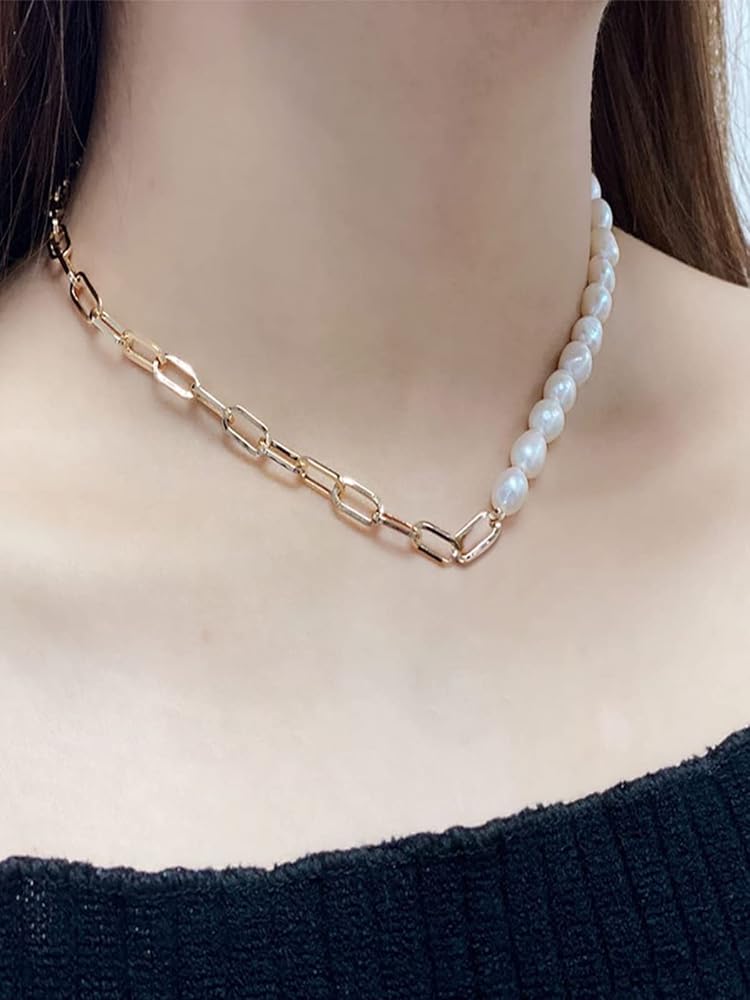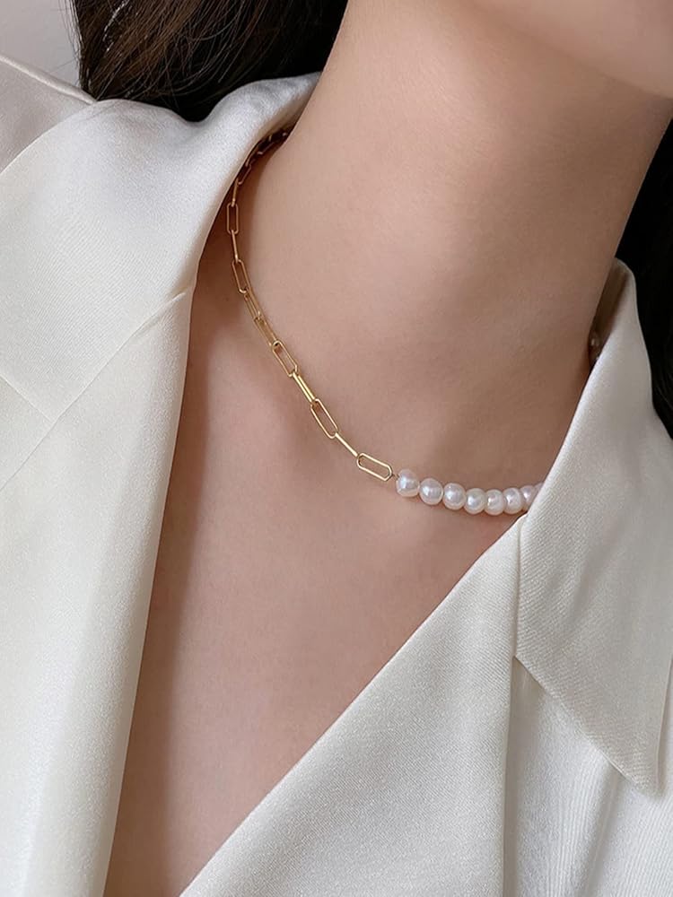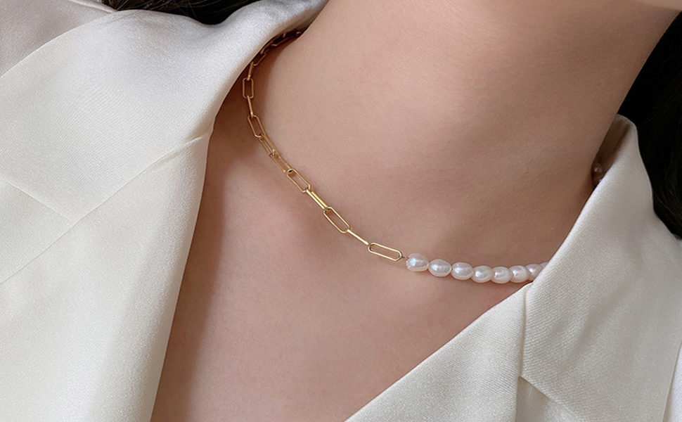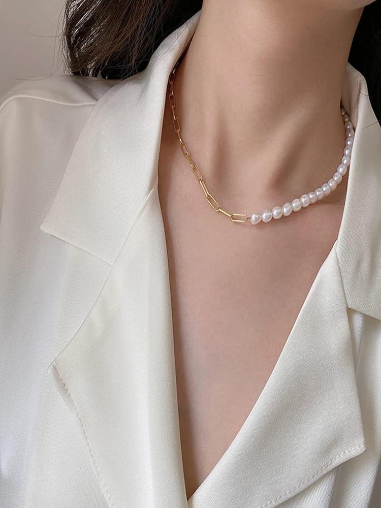 قلادة رقيقة من اللؤلؤ الأبيض: تصميم عصري فريد، مزيج مثالي من الطراز القديم والعصري. هذه القلادة الرائعة من اللؤلؤ المقسمة على شكل مشبك ورق هي لامعة وأنيقة وأنيقة. يمكن ارتداؤه بمفرده أو مع قلادات أخرى.