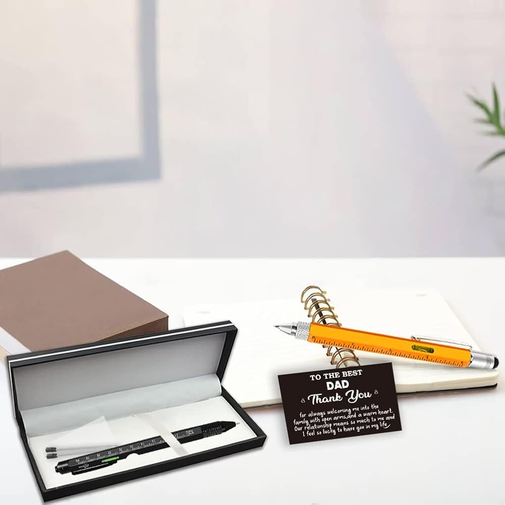 يأتي مع صناديق هدايا: يأتي القلم متعدد الأدوات مع صندوق هدايا أسود رائع وبطاقة تهنئة مع كلمات: "إلى أفضل أب، شكرًا لك، على الترحيب بي دائمًا في العائلة بأذرع مفتوحة وقلب دافئ. علاقتنا تعني الكثير بالنسبة لي وأشعر أنني محظوظ جدًا لوجودك في قلبي".