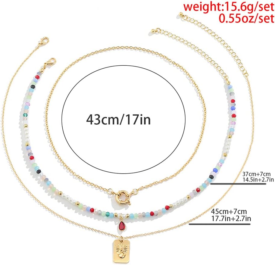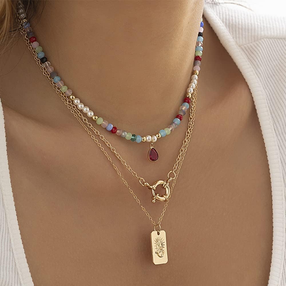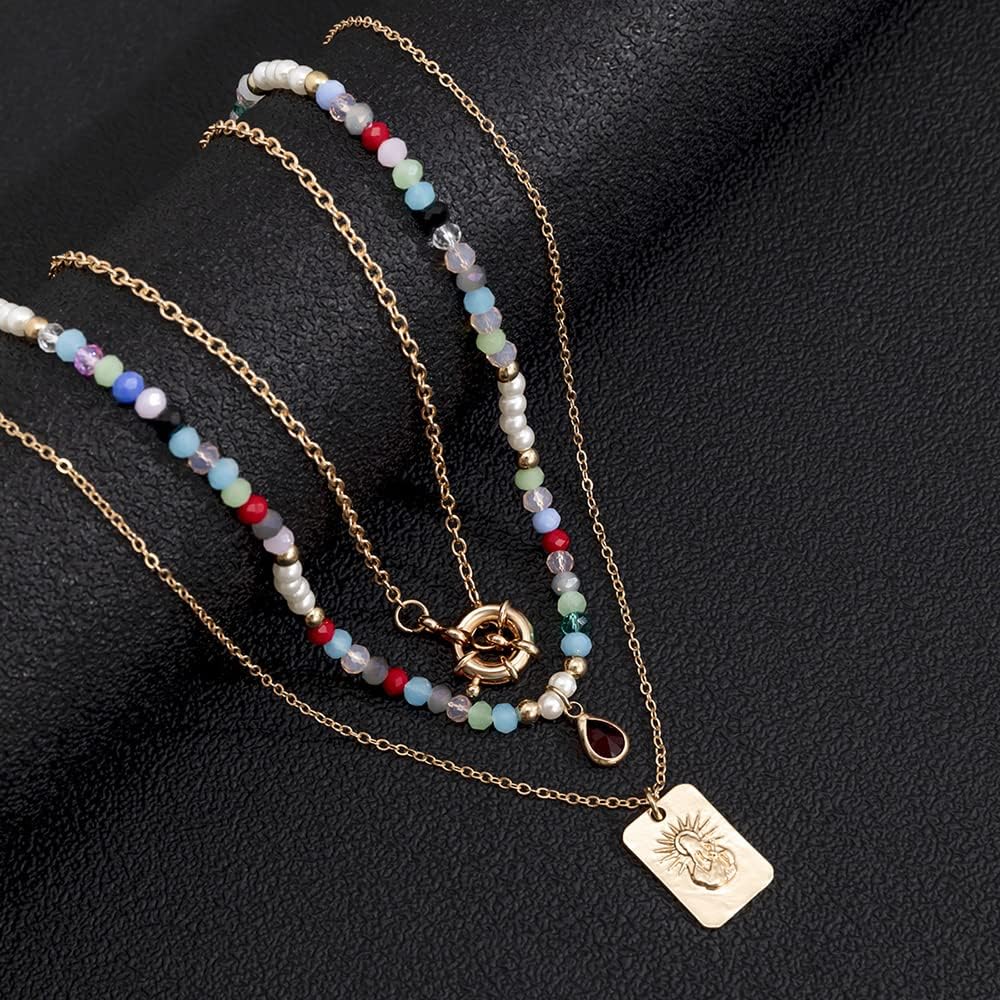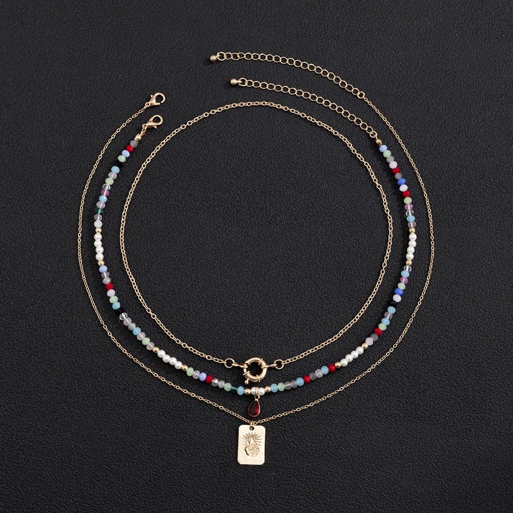 قلادات بوهيمية مطرزة بالخرز، قلادات كريستالية مكعبة خضراء أنيقة، قلادة ذات طبقات للنساء والفتيات