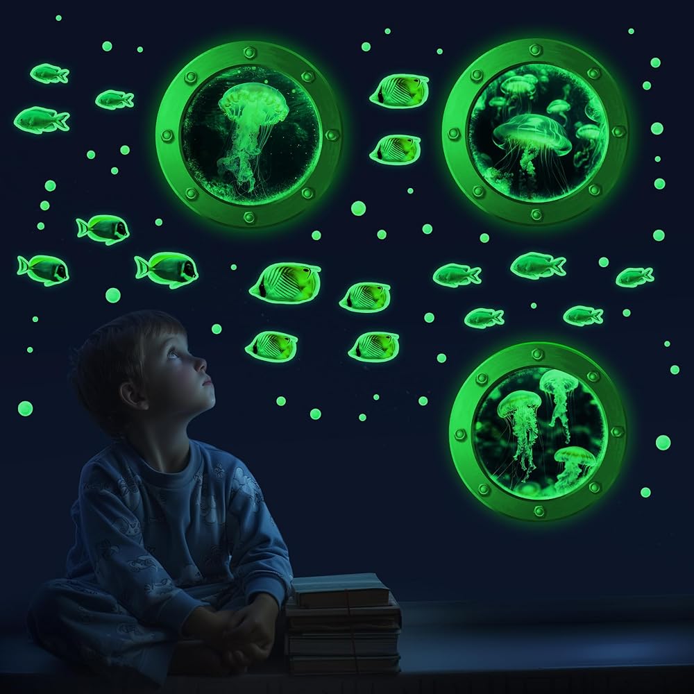 【تشمل العبوة】- 47 قطعة من ملصقات الحائط المتوهجة في عالم المحيط، بما في ذلك سمكة قرش واحدة و13 سمكة و33 فقاعة. حجم سمكة القرش 11.4*13.3 بوصة.