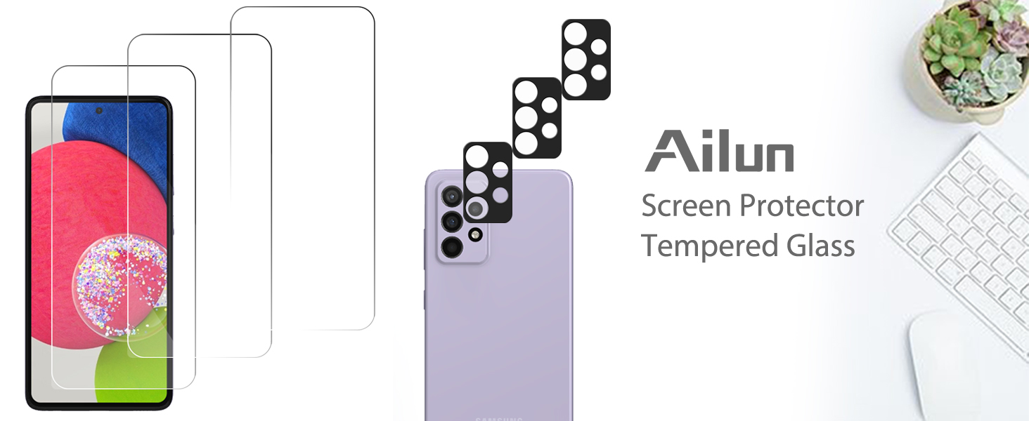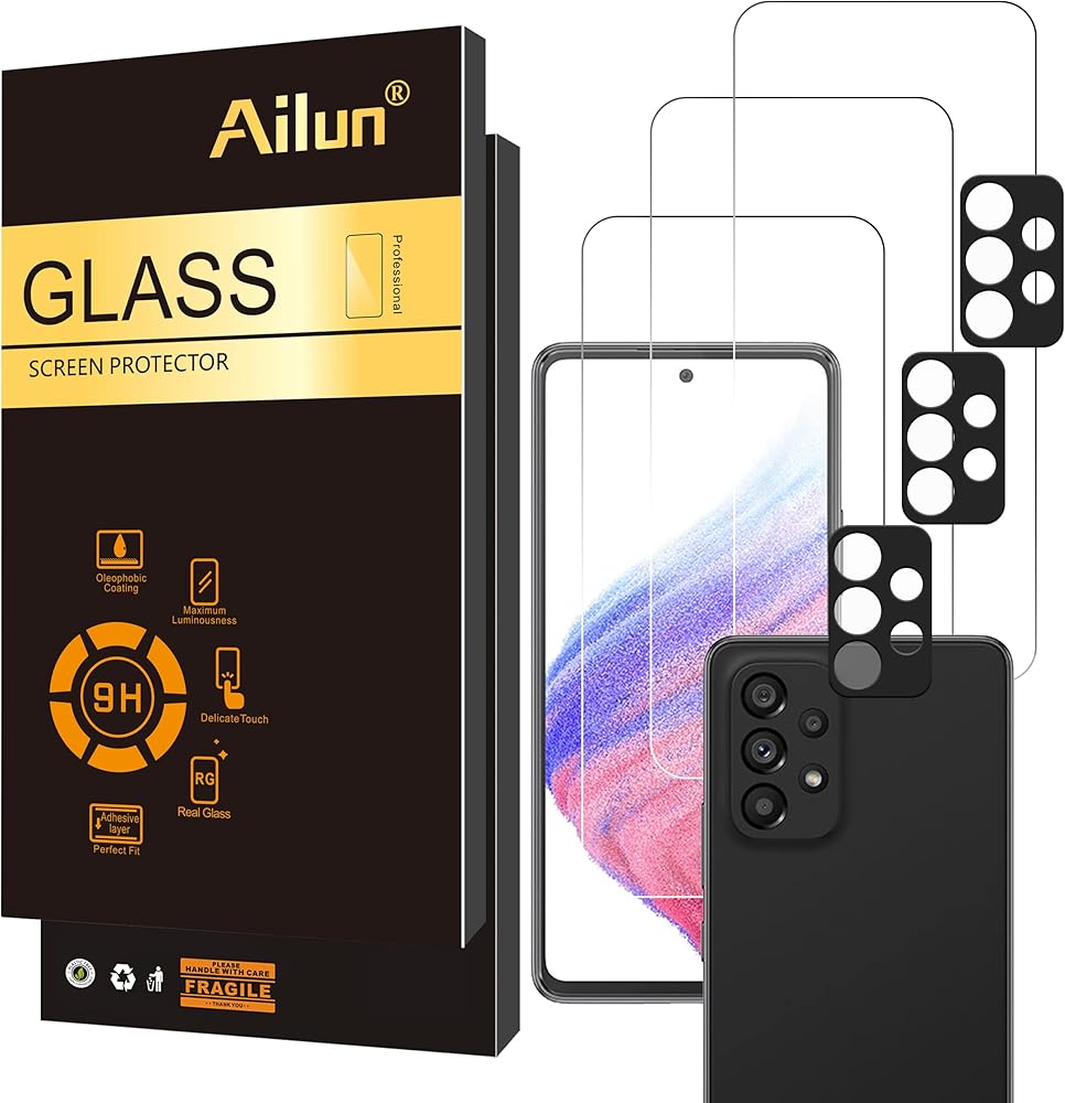 واقي شاشة Ailun لهاتف Galaxy A53 5G 6.5 بوصة [3 عبوات]+ [3 عبوات] واقي عدسة الكاميرا، زجاج مقسى، فائق الوضوح، مضاد للخدش، صديق للحافظة